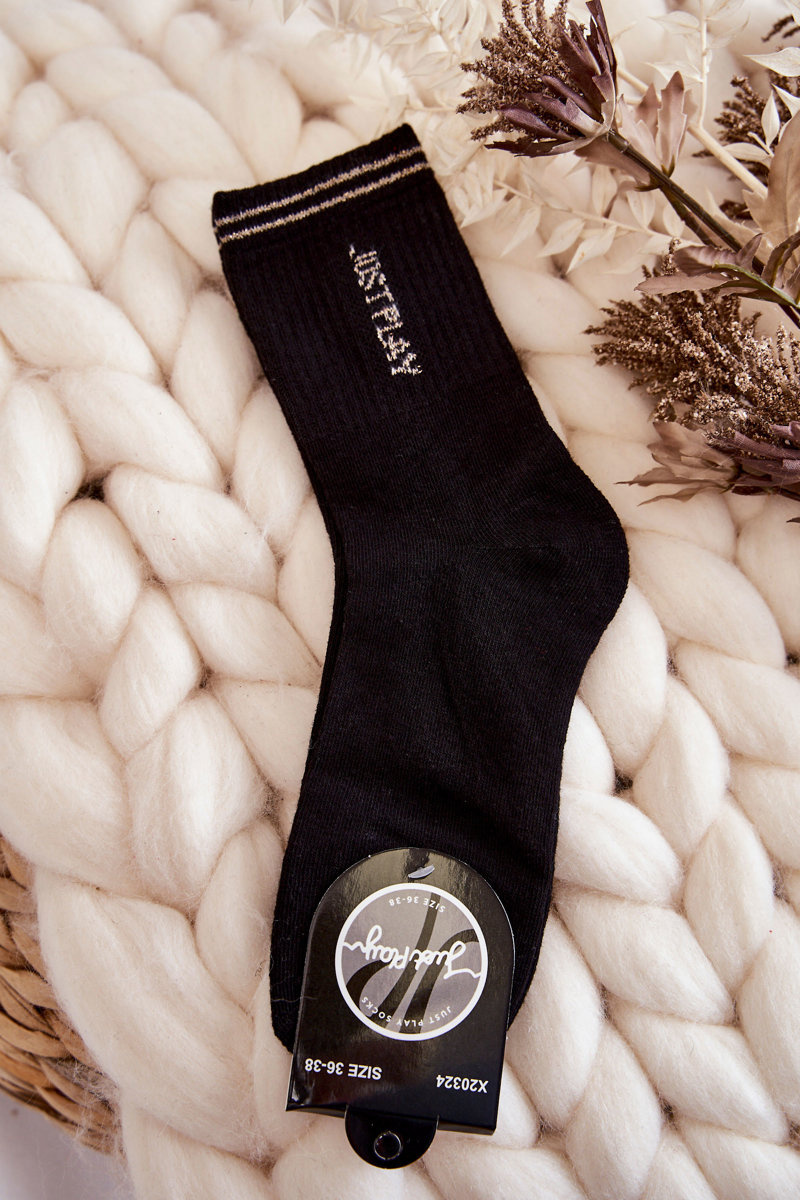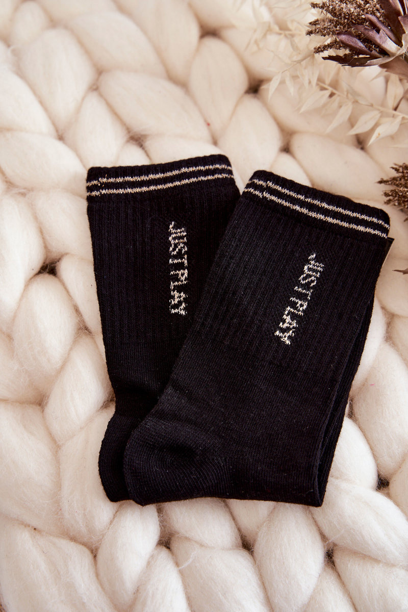 Sports, women's socks will look great with low sports shoes. The inscription and stripes at the welt have been enriched with lurex, i.e. a shiny thread. The upper part of the sock is slightly ribbed. Extremely comfortable, made of 100% cotton. You absolutely must have them!