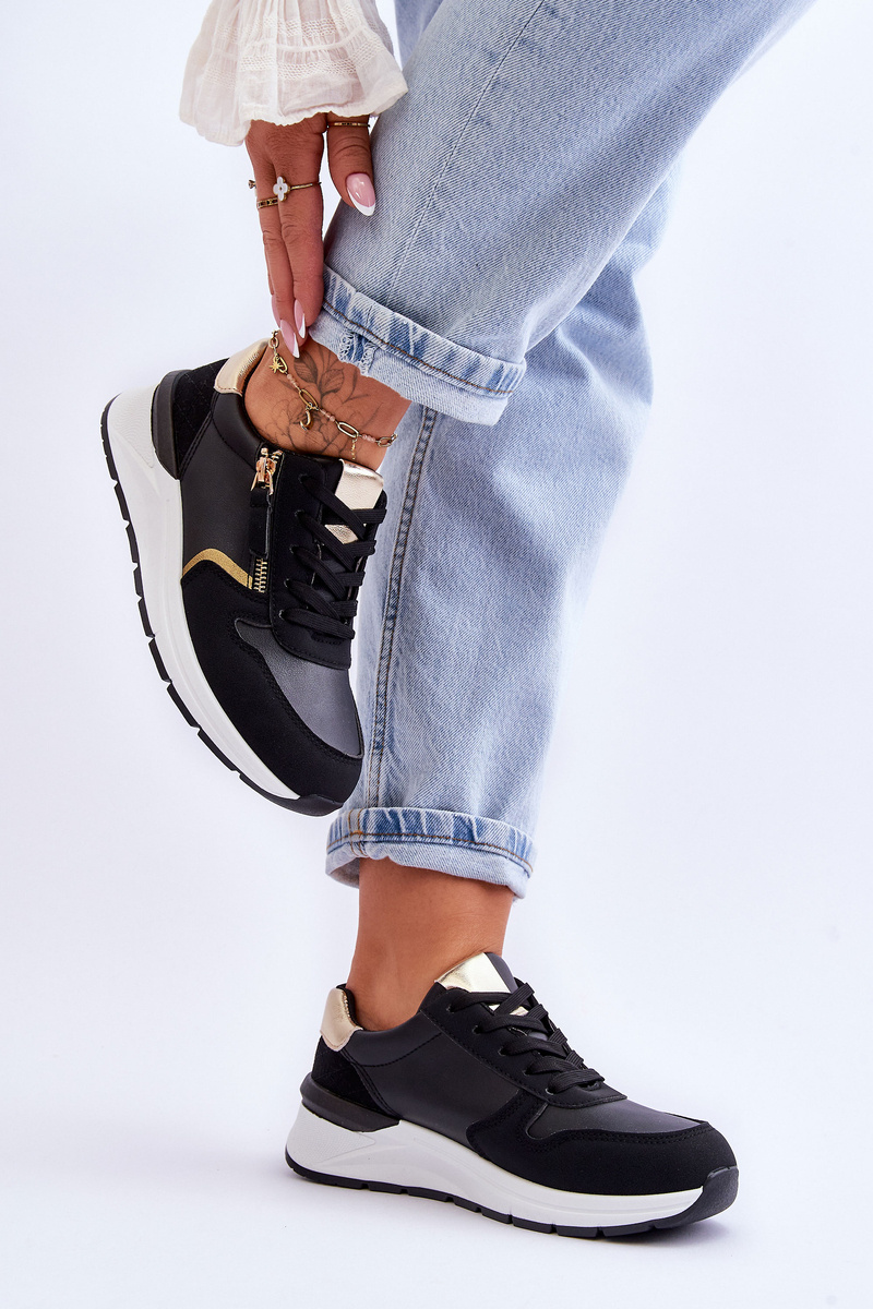 Women's sports shoes are made of eco leather. This model is classically laced. These shoes have a decorative, zip-up zipper. Perfect footwear for everyday use, for work or school. These shoes were placed on a platform and a wedge heel. The insole in these shoes is made of fabric. When choosing a size, please refer to the size chart.