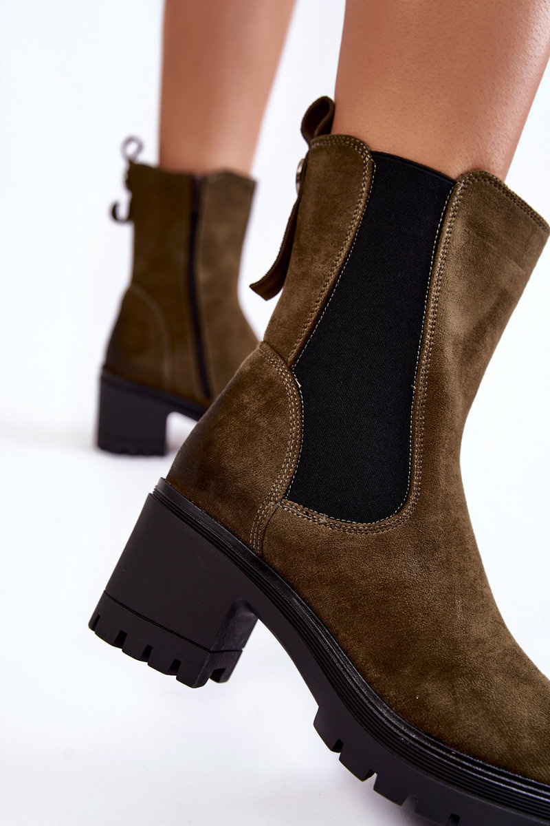 Fashionable women's boots have been mounted on a heel in the form of a massive post and a platform with grooves. They were made of eco suede. The boots have been insulated with a shoe blanket. Additionally, they have a stiff heel counter. They have fastening on the side of the upper. This cut will surely match many autumn stylizations! When choosing a size, please use the size chart.