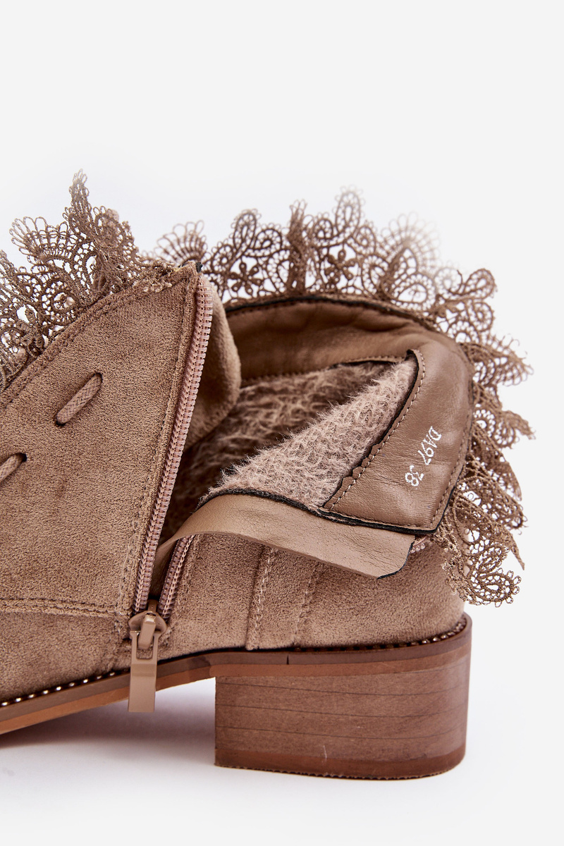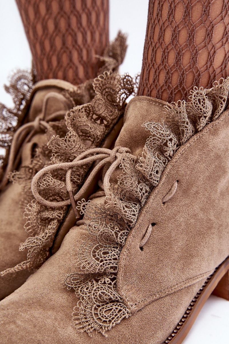 Women's ankle boots with a block heel. Set on a flat heel. Round toes. Fastened with a zipper on the side and additional lacing at the front. The interior is lined with a shoe blanket. The upper is decorated with lace. Additionally, this model has a stiffened toe cap. When choosing a size, please refer to the size chart.