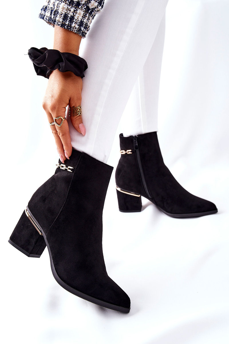 Boots made of high quality suede ecological leather. The inside is covered with a warm shoe blanket. Almond-shaped cut, combined with a gold ornament on the stiletto heel and a beautiful chain on the upper - they are simply gorgeous! A zipper on the side makes putting them on easier. Please refer to the size chart when choosing your size.