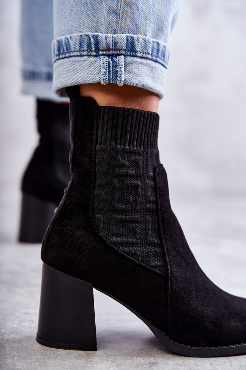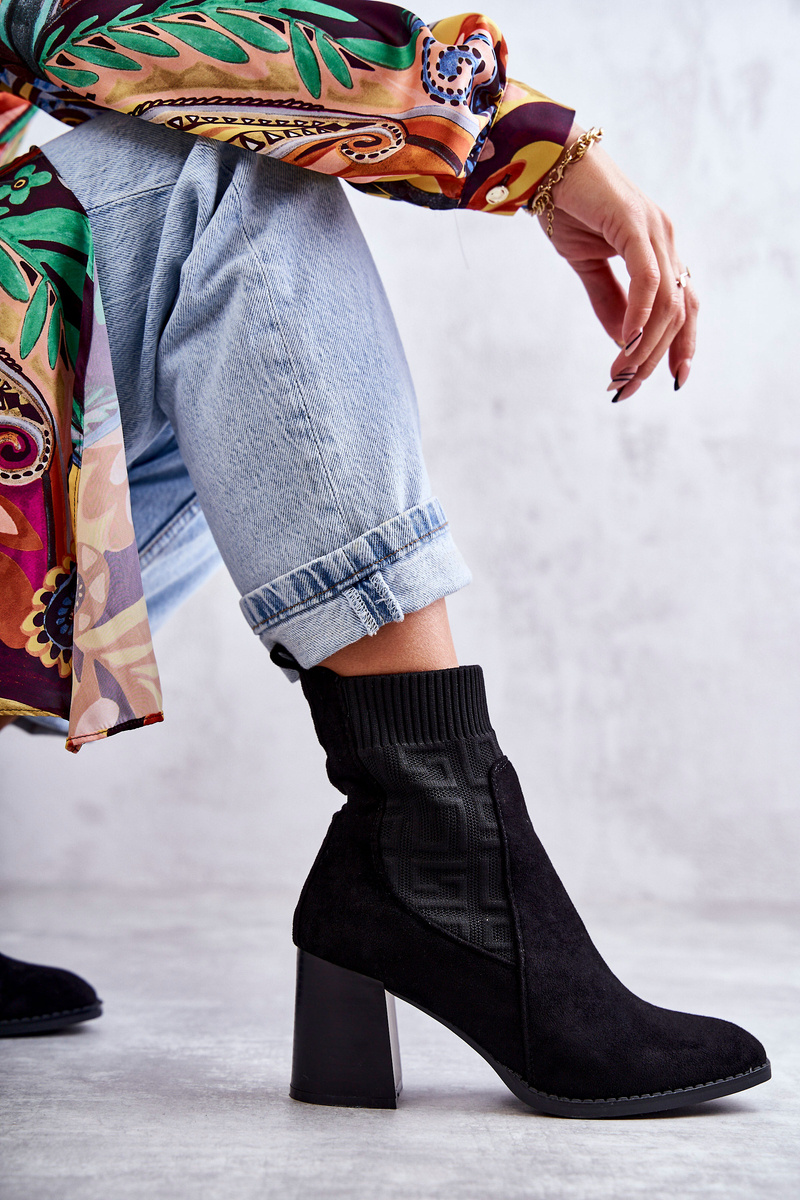 Great women's boots with a fashionable cut. Made of a combination of eco suede and elastic fabric. This model is mounted on a heel in the form of a massive post. The toe is square. The boots have a stiff heel counter. Inside, they are partially insulated with a shoe blanket. You will use them in many situations: at work, meeting friends or on a date. When choosing a size, please use the size chart.