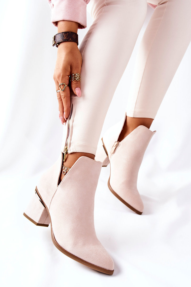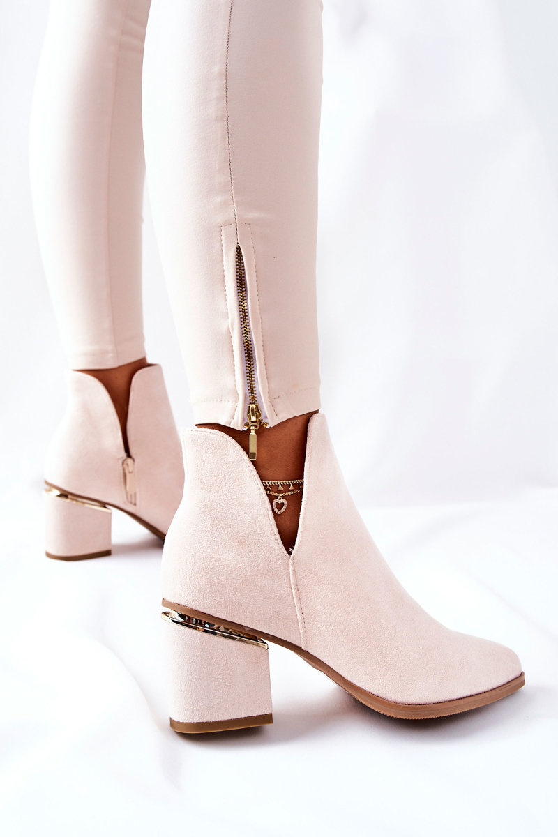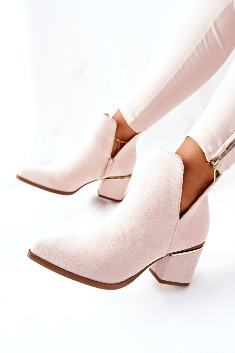 Classic boots, available in several colors. The upper with cut-outs on the side, made of ecological suede. Thanks to the gold decoration on the stiletto, they look great in every outfit. On the side there is a delicate zipper for easy putting on. Please refer to the size chart when choosing your size.