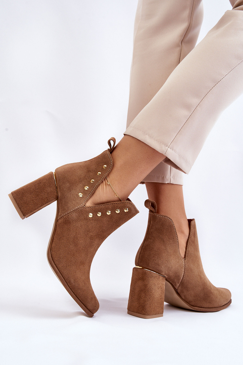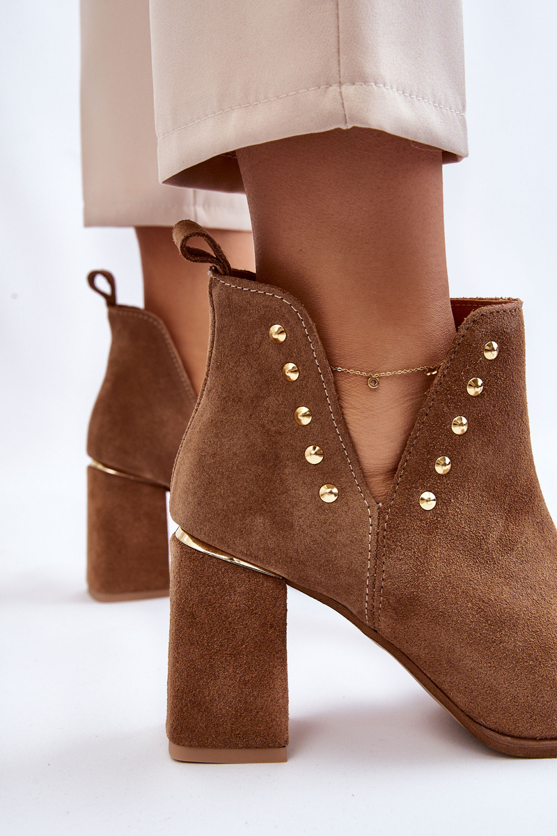 Boots are an inseparable element of autumn-winter stylizations. Lewski has proposals for every season. The presented model will be perfect for autumn stylizations, thanks to its delicate cut. Decorations on the upper in a form of gold rhinestones and a gold insert on the heel emphasize their elegant style. Booties are made of natural suede.