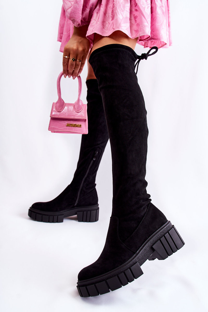 Beautiful women's boots with uppers above the knee. The model is made of pleasant to the touch eco suede. Fastened with a zipper on the side of the upper. In addition, the boots have a binding, thanks to which they can be properly adjusted. The model is mounted on a massive flat heel and a platform. The boots have insulation in the form of a footwear blanket only at the height of the foot. Stiffened heel. When choosing a size, please use the size chart.