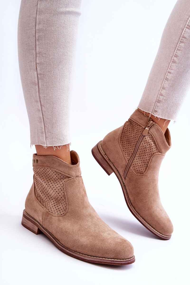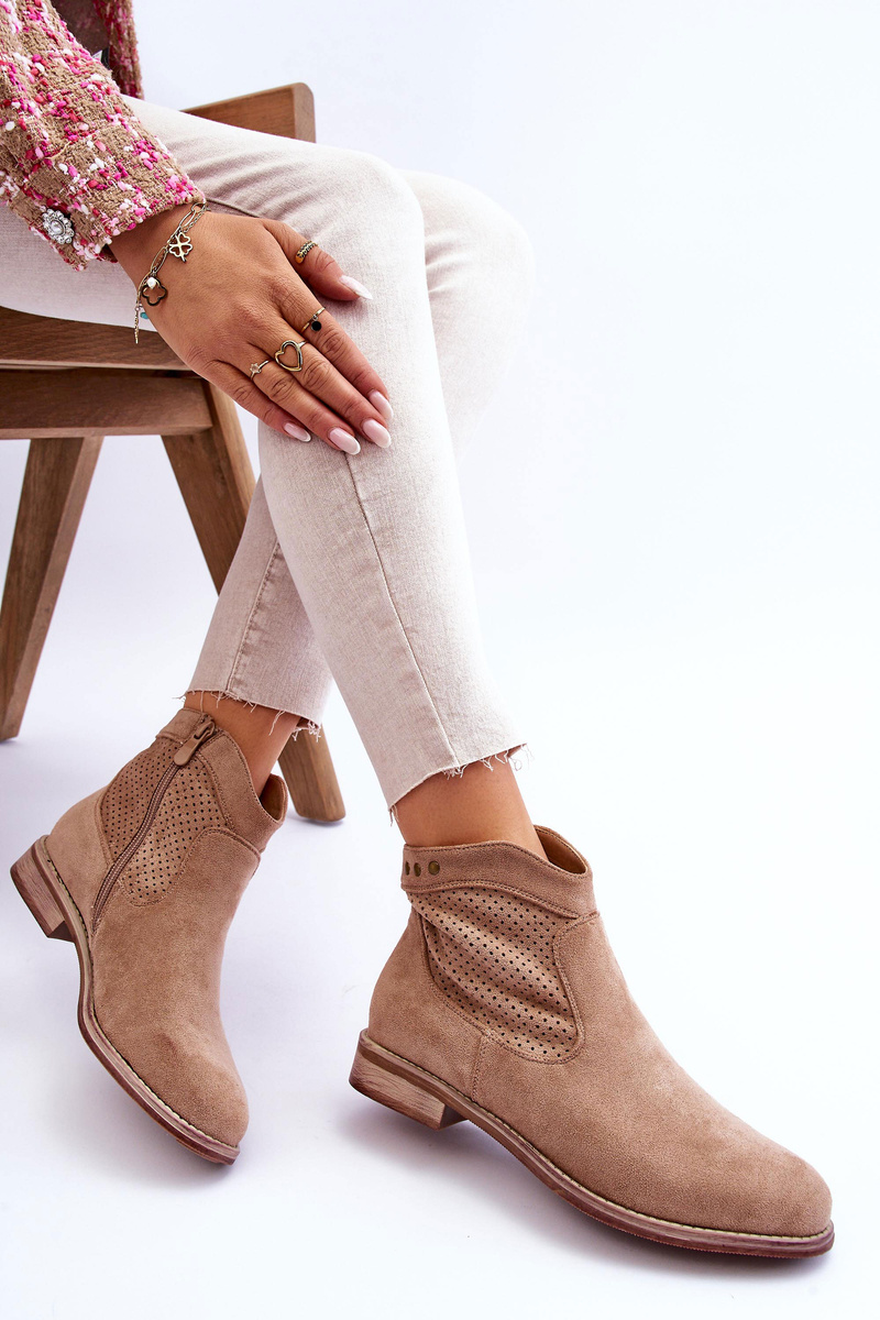 Classic boots made of pleasant to the touch eco suede with an openwork upper. They have decorative elements in the form of studs. Set on a flat heel. In addition, the boots have a stiffened heel counter. On the side of the upper there is a slider for easy putting on shoes. Be sure to also check out the other models of boots available in our offer! When choosing a size, please refer to the size chart.