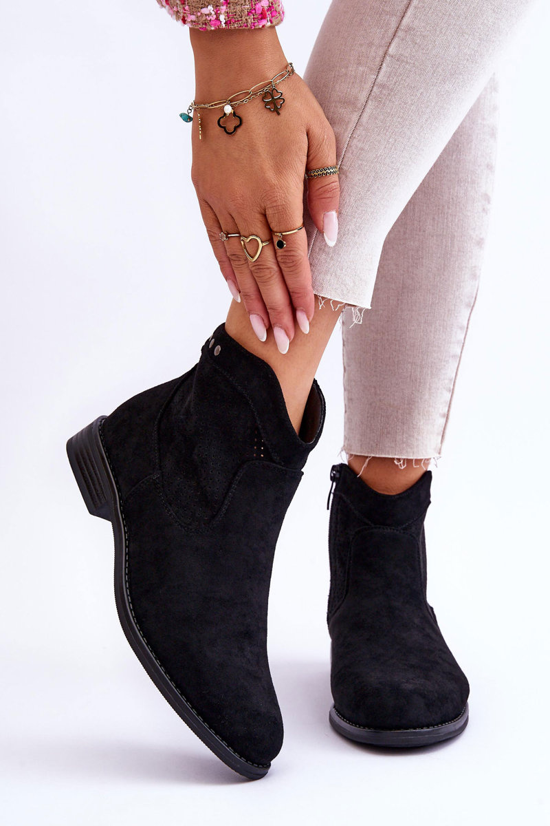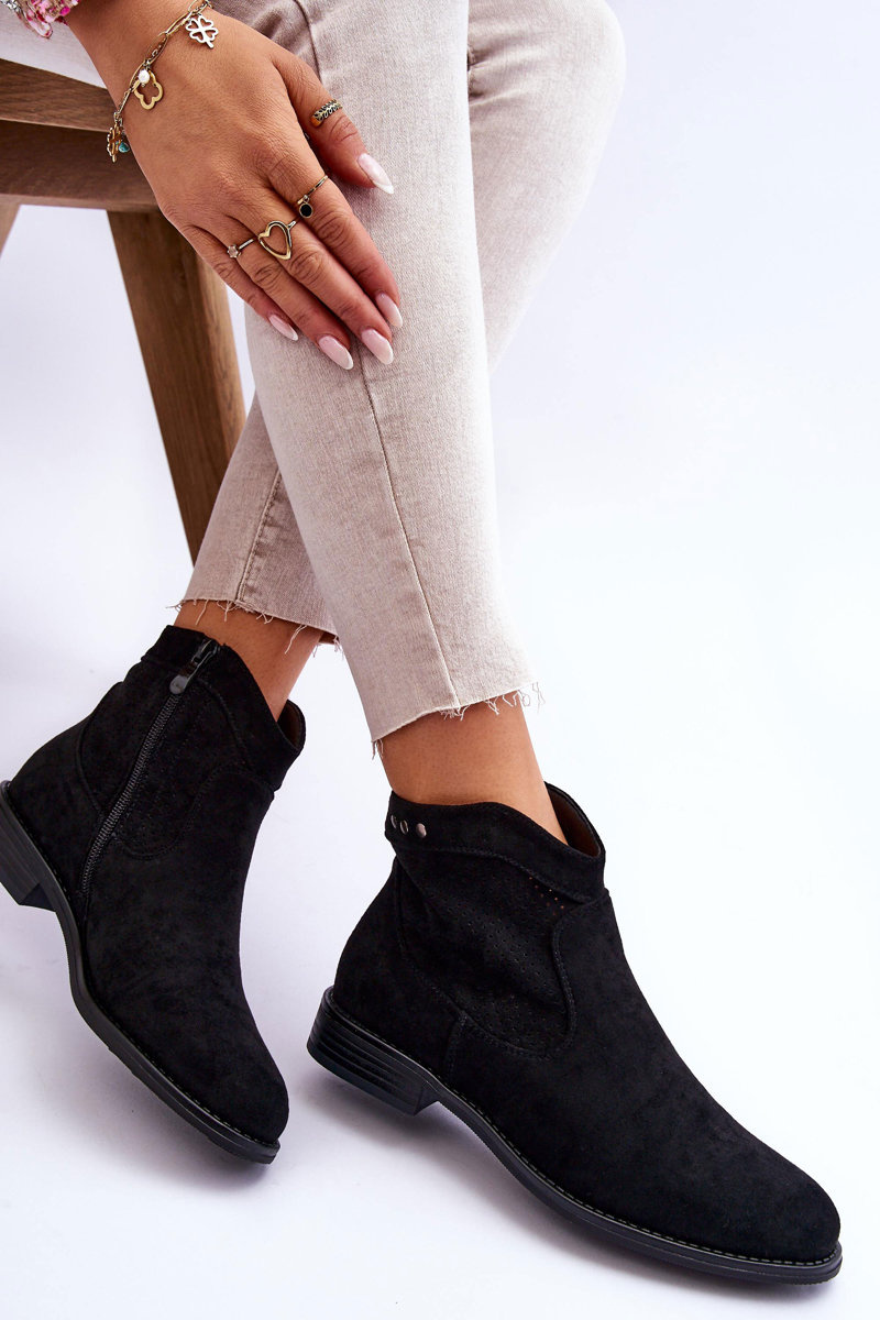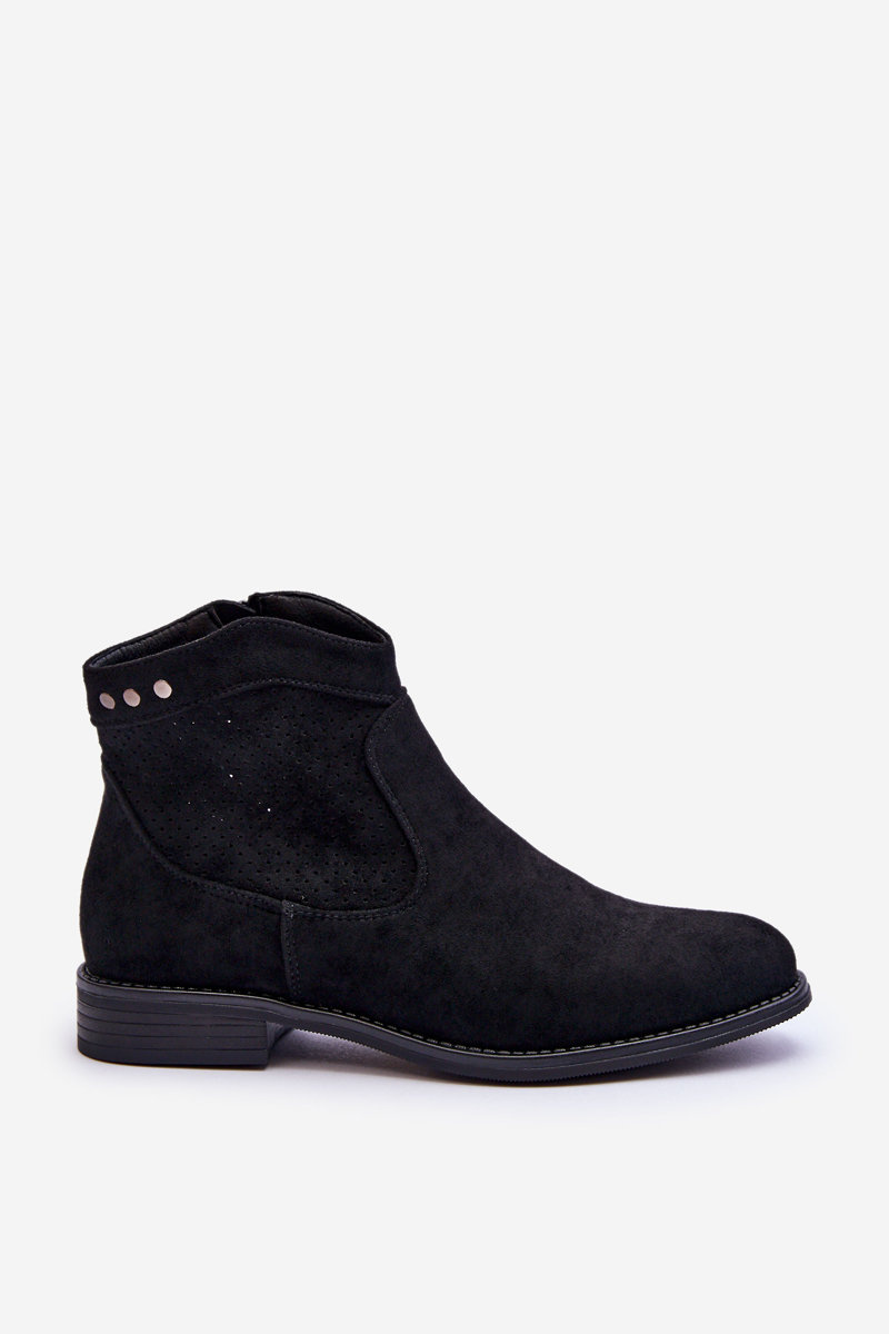 Classic boots made of pleasant to the touch eco suede with an openwork upper. They have decorative elements in the form of studs. Set on a flat heel. In addition, the boots have a stiffened heel counter. On the side of the upper there is a slider for easy putting on shoes. Be sure to also check out the other models of boots available in our offer! When choosing a size, please refer to the size chart.