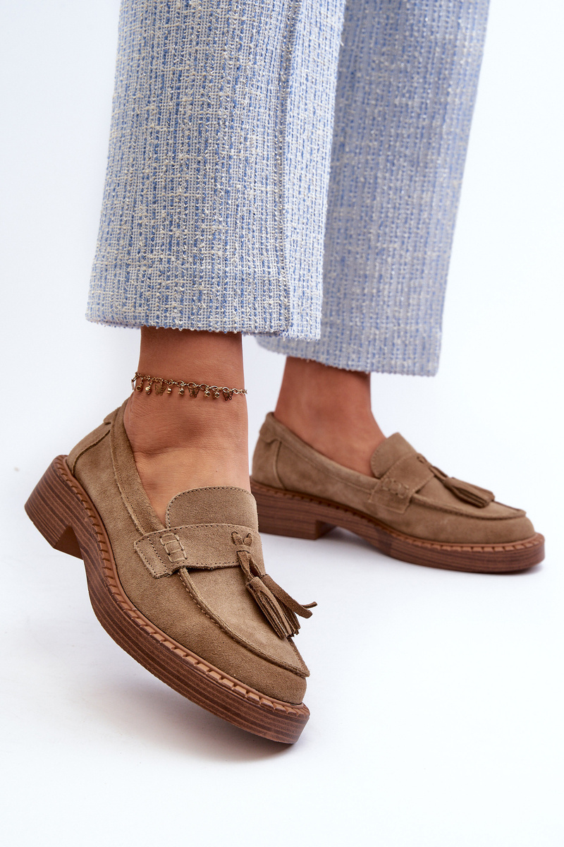 Women's moccasins made of natural suede. Set on a flat, stable heel. The fringes add a unique charm to them. These moccasins will be the perfect complement to many different styles, both casual and more elegant. When choosing a size, please refer to the size chart.