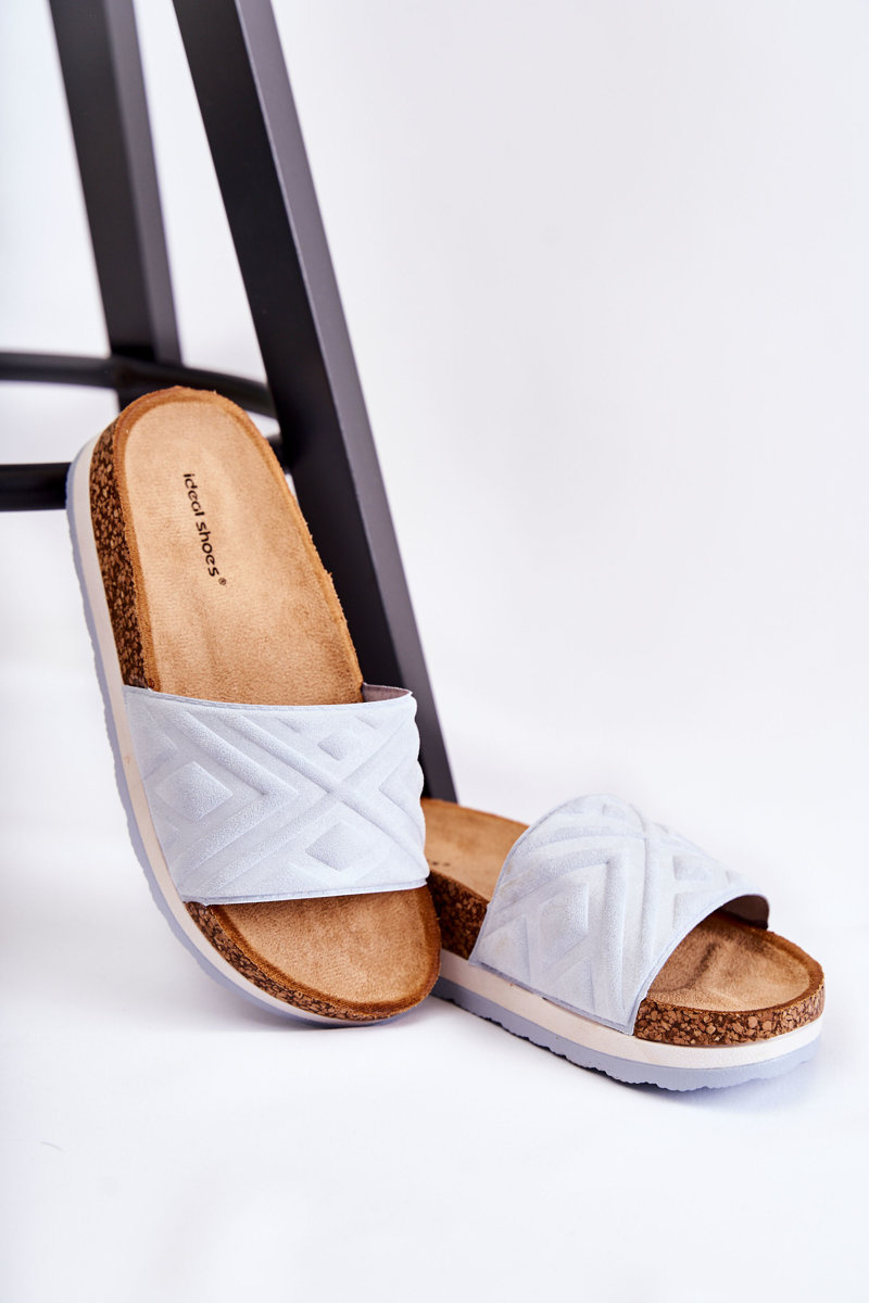 Fashionable women's slippers made of eco suede pleasant to the touch. The model is mounted on a massive cork platform with a plastic sole. The insole is profiled and also made of eco suede, which will ensure comfort during use. Open toe model. A great design for hot days that you should have in your wardrobe! When choosing a size, please use the size chart.