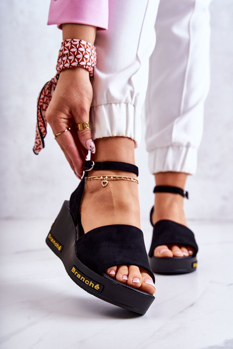 Fashionable women's sandals mounted on a wedge heel and a delicate platform. Made of pleasant to the touch eco suede. The strap is adjustable and fastened with a buckle. The insole is soft and made of eco leather. There are inscriptions made of rubber material on the platform. A wider strap on the front perfectly holds the foot against sliding. A perfect summer model that you should have in your wardrobe! When choosing a size, please use the size chart.