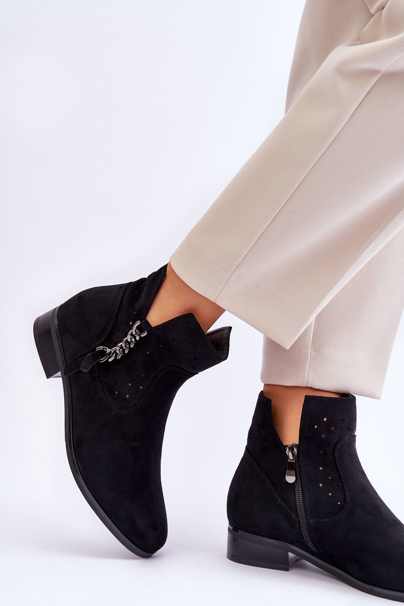 The boots are made of eco suede. They have an openwork decoration on the upper and a decorative chain. Inside the footwear, the insole is made of eco leather. Putting on will be facilitated by the zipper sewn on the side. A flat heel will ensure stability at every step. This model additionally has a stiffened heel. The toe in the shape of a delicate almond optically slims the foot. When choosing a size, please refer to the size chart.