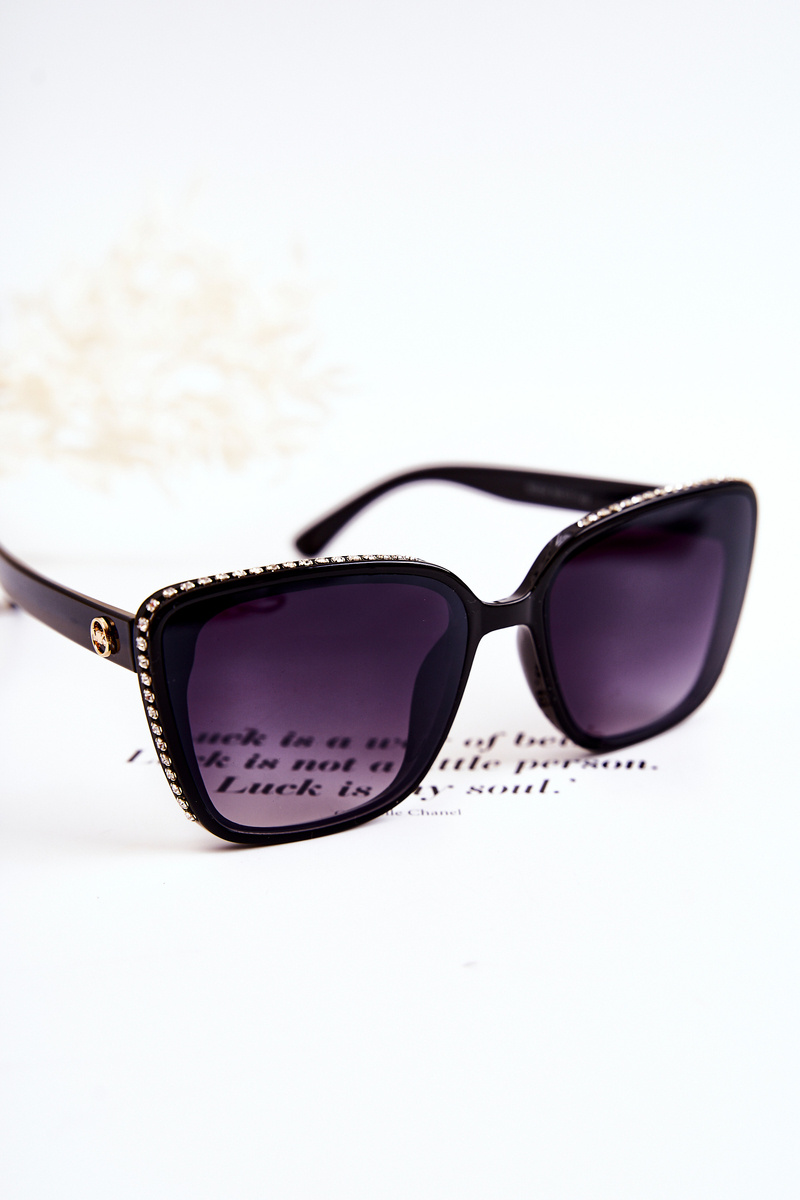 Fashionable sunglasses are great for many situations! Not only in the summer season, but also in the winter season, when the sun's rays reflect off the snow. Cat eye shape model. Made of plastic. Lenses with delicate frames decorated with rhinestones imitating rhinestones. Classic, slender temples with a decorative logo. Information from the manufacturer: glasses protect against harmful UV radiation, category 3.