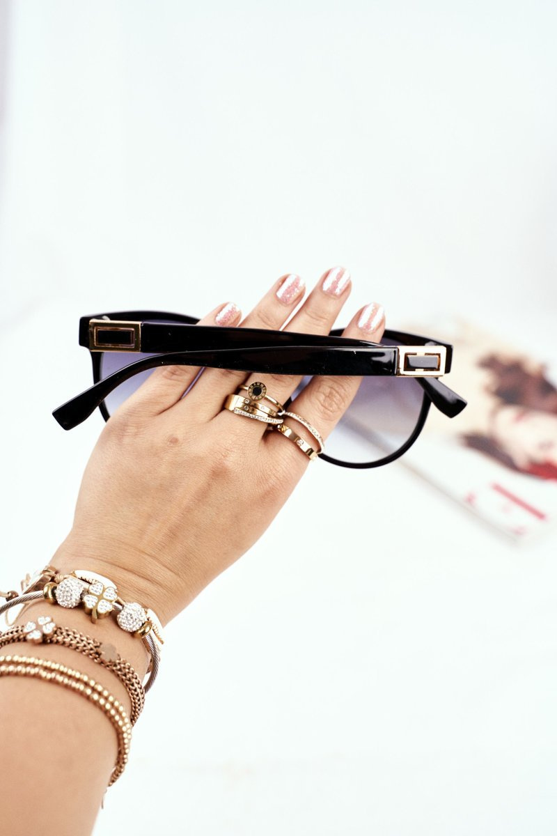The glasses have lenses with a beautiful gradient of black and fashionable decorations on the temples visible in the pictures.The photos are of our authorship and represent the product being sold.