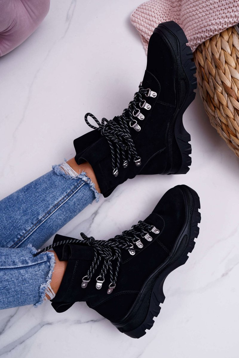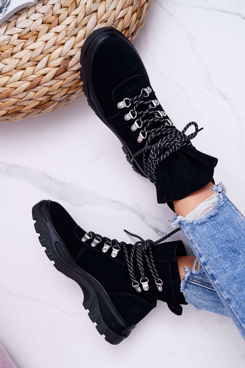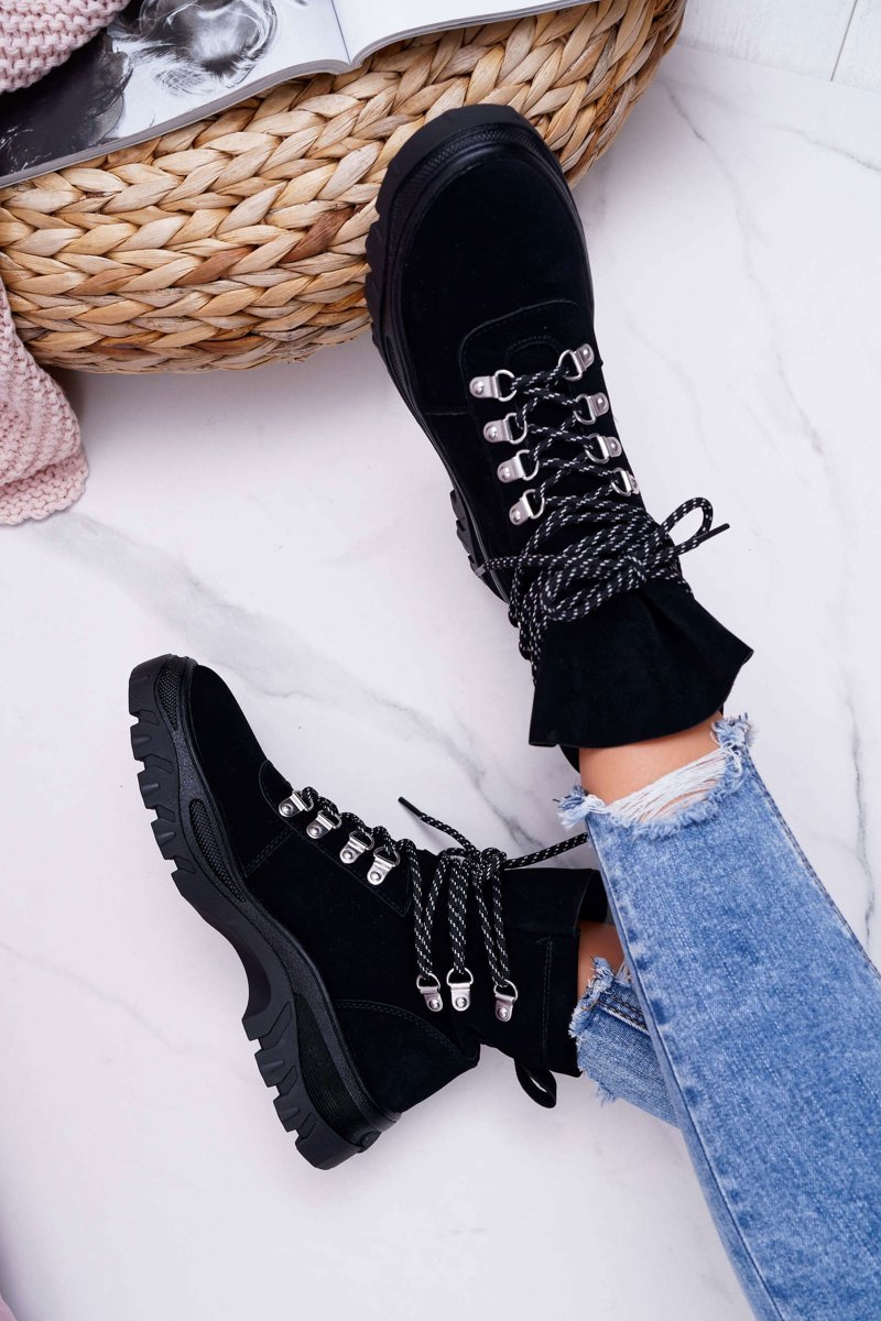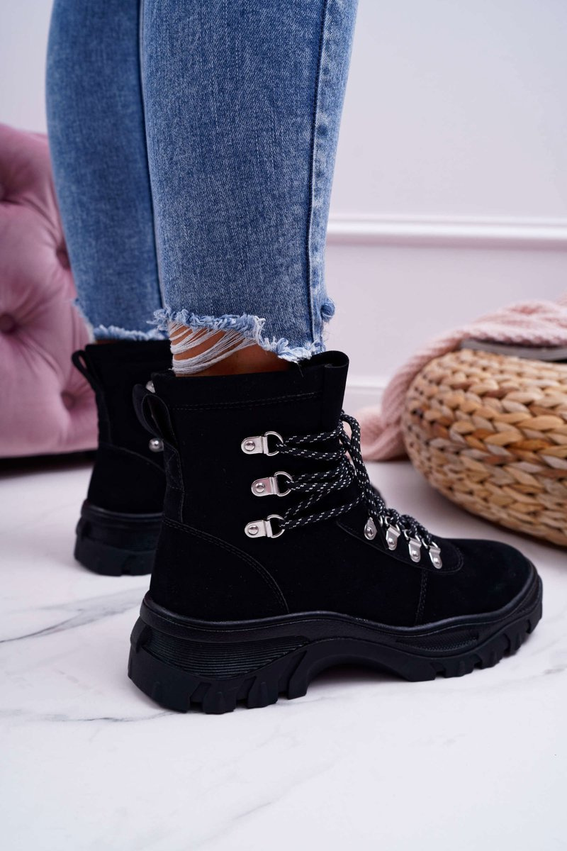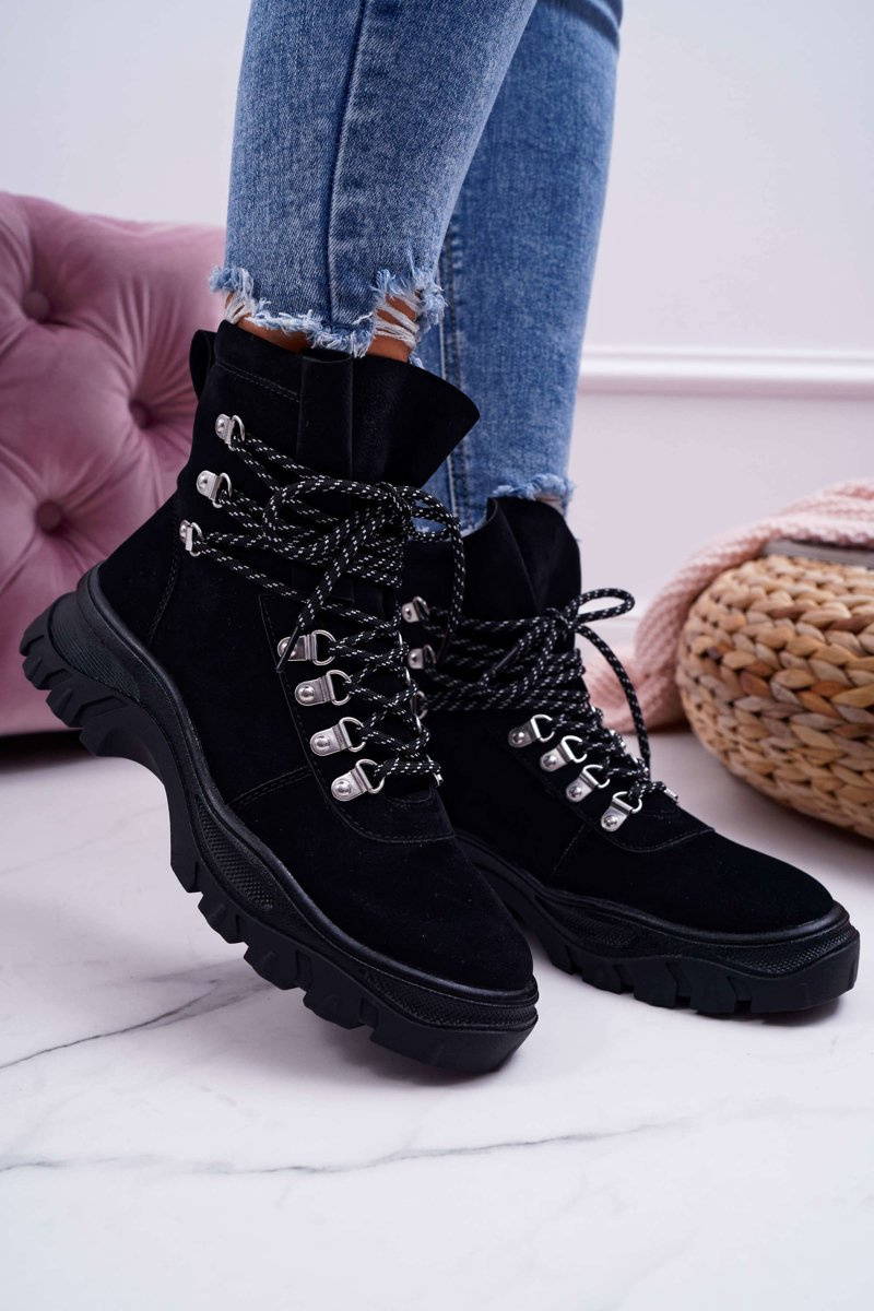 Trappers have become an indispensable part of autumn and winter styling. One of the trends of this season will be these wonderful boots on a thick sole. The upper is eco-suede in a classic black color. The interior is covered with a shoe blanket with short hair, which will ensure our comfort in any situation. When choosing the size, please suggest the size chart.