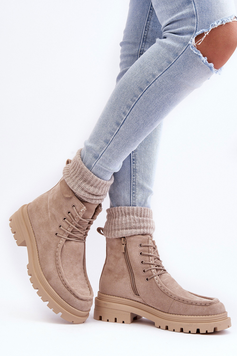 Women's boots made of eco suede. Zipped on the side. Inside insulated with a shoemaker's blanket. Flat heel and platform provide stability with every step. Additional lacing on the front. Rounded toes. Reinforced heel. The shoes are perfect for winter days! When choosing a size, please refer to the size chart.