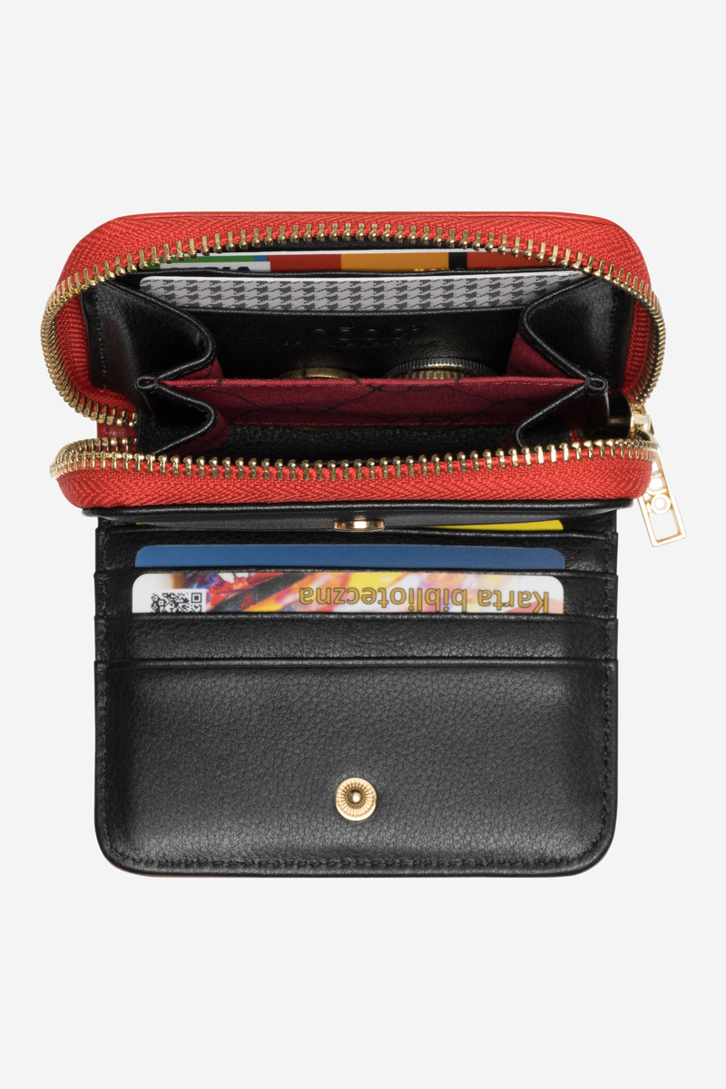 Small women's wallet is made of smooth natural leather. Inside, there are twelve card pockets. In the zippered pocket, there is a compartment where you can fit banknotes and coins. The model is packed in an elegant red box. Perfect for a gift!