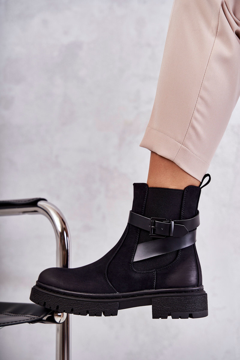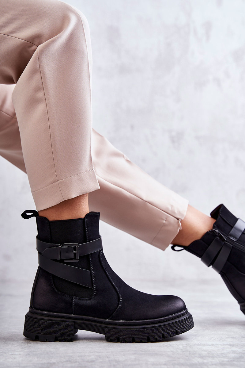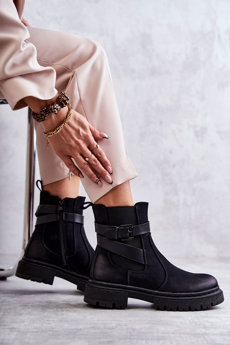 Unique women's boots are made of eco suede. These Chelsea boots have a decorative, eco-leather belt on the side of the upper, fastened with a buckle. Additionally, the boots are fastened with a zipper. Fitted on a flat heel and platform. The inside was insulated with a shoe blanket. A great model for many styles! You can wear them both with trousers and a skirt. When choosing a size, please use the size chart.