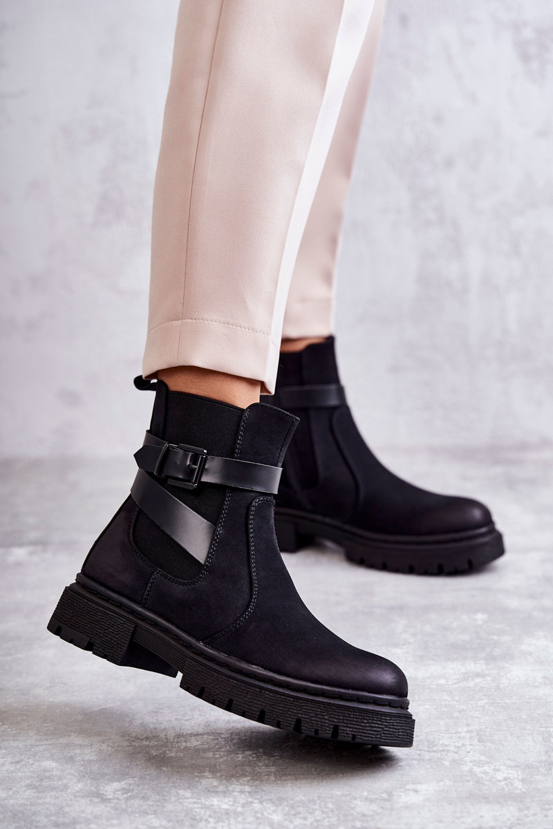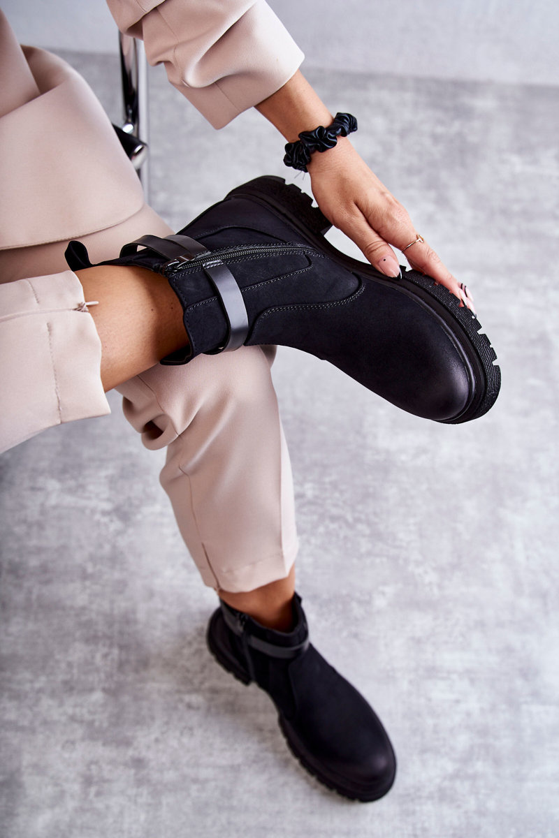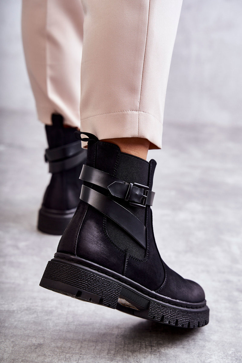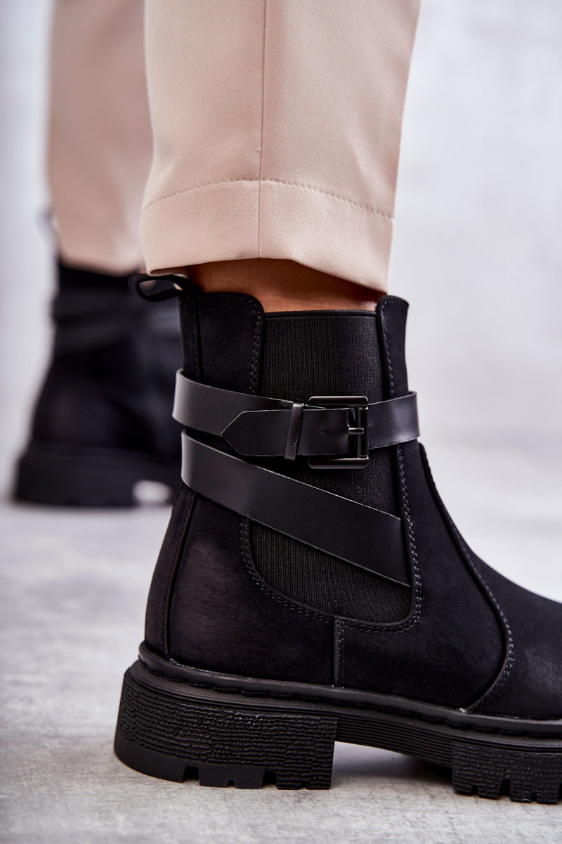 Unique women's boots are made of eco suede. These Chelsea boots have a decorative, eco-leather belt on the side of the upper, fastened with a buckle. Additionally, the boots are fastened with a zipper. Fitted on a flat heel and platform. The inside was insulated with a shoe blanket. A great model for many styles! You can wear them both with trousers and a skirt. When choosing a size, please use the size chart.