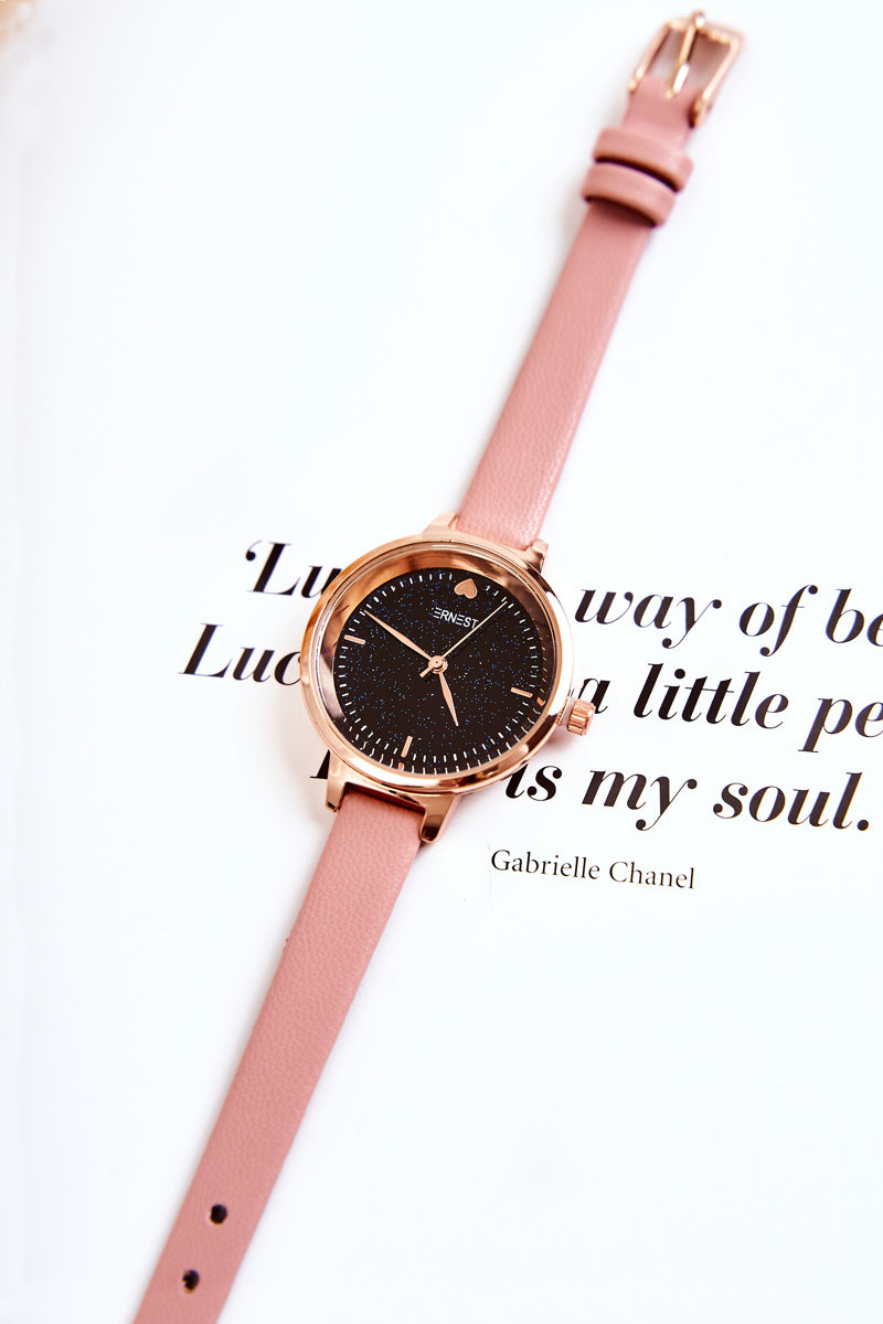 The Ernest watch is a model for women who appreciate elegant and subtle design. The watch has an adjustable strap made of ecological leather. Fastened with a buckle. A dial with a delicate heart and glitter. Made of stainless steel. It does not contain nickel.