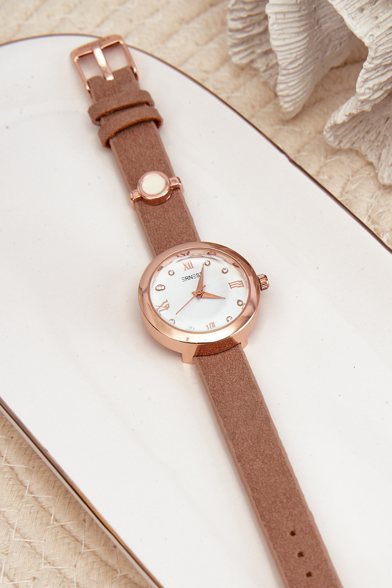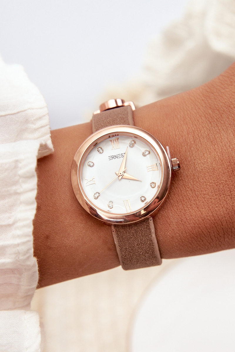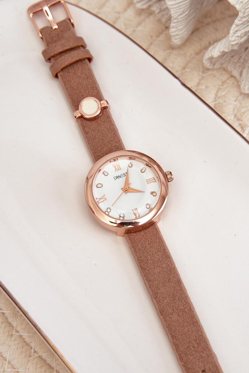 Women's watch with a eco leather strap from the brand Ernest. The watch dial is adorned with zircons, giving it a unique shine and charm. Thanks to the possibility of adjusting the strap, the watch fits perfectly to any wrist size, ensuring comfortable wearing and a stylish look. An ideal choice for both everyday wear and more special occasions.