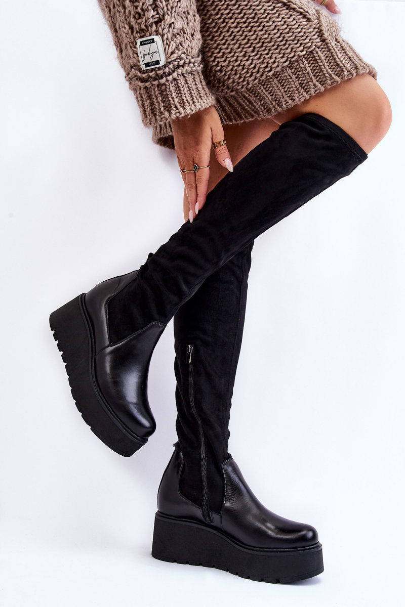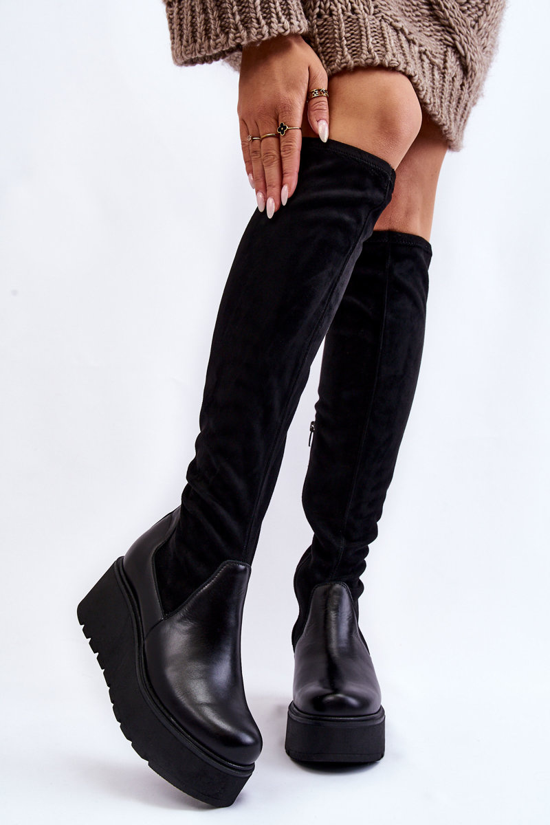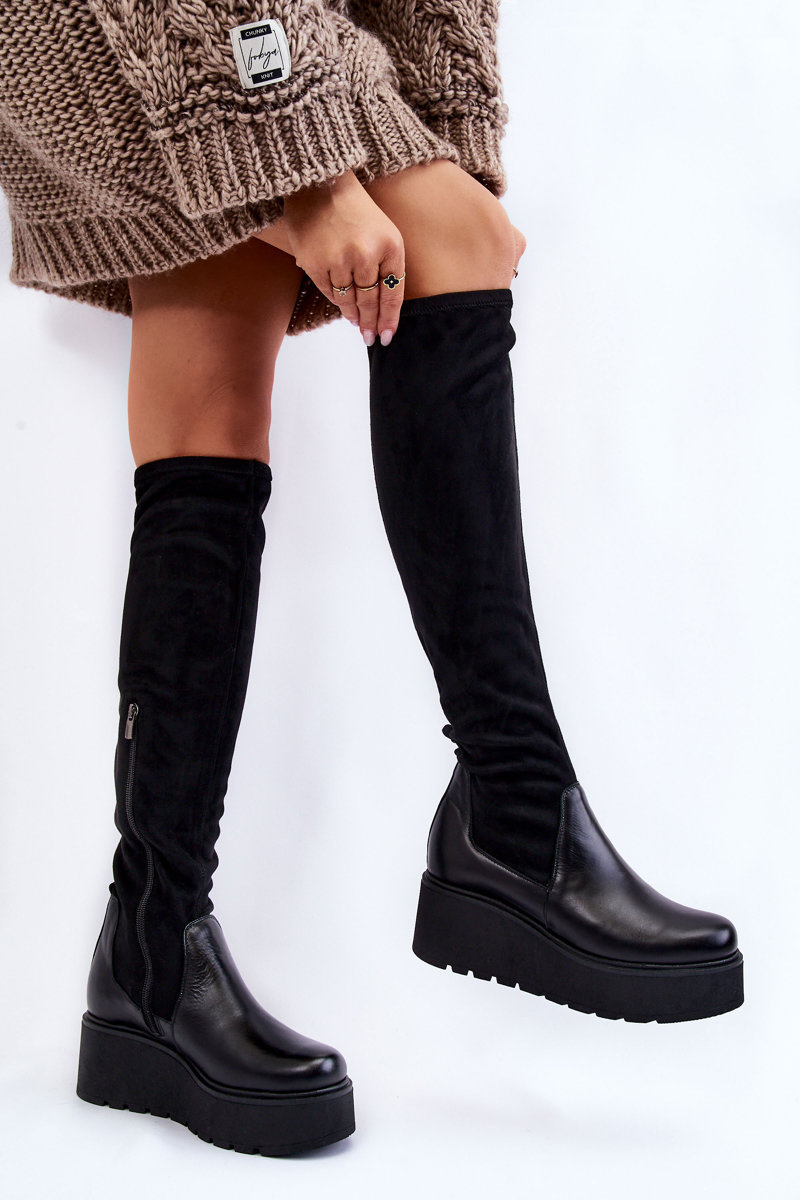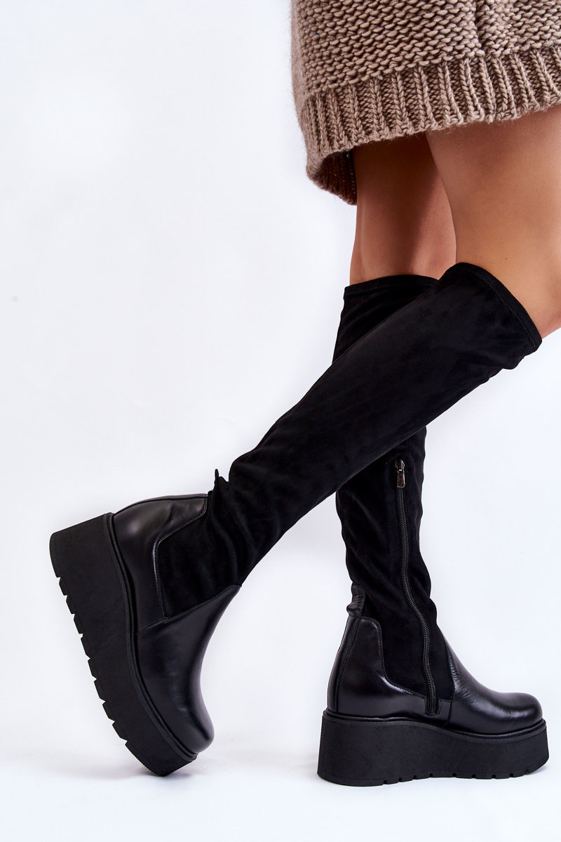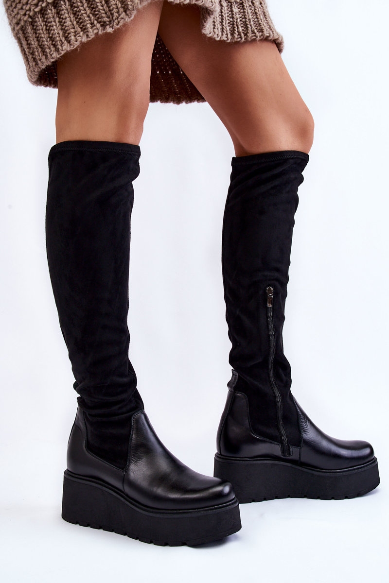 Laura Messi women's boots are made of a combination of natural leather and textile material. This model has a leather insole and a stiffened heel counter. The boots are slip-on, with an additional zipper on the side of the upper. Set on a wedge heel and a massive platform. The sole made of rubber material is non-slip. When choosing a size, please refer to the size chart.