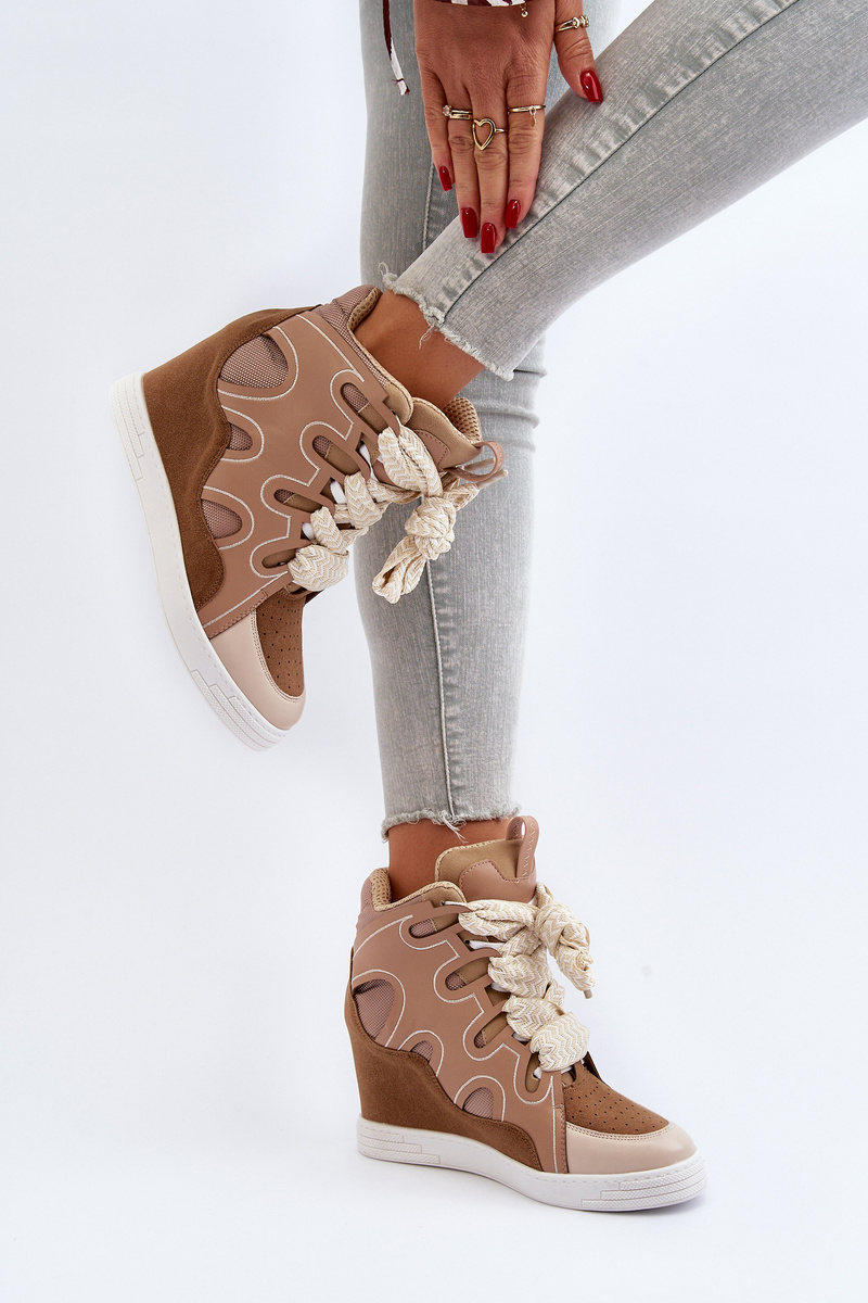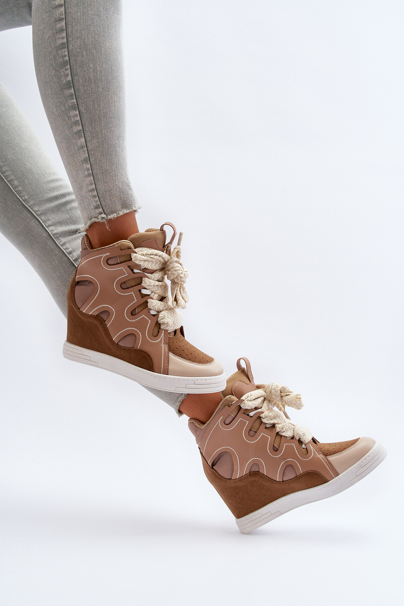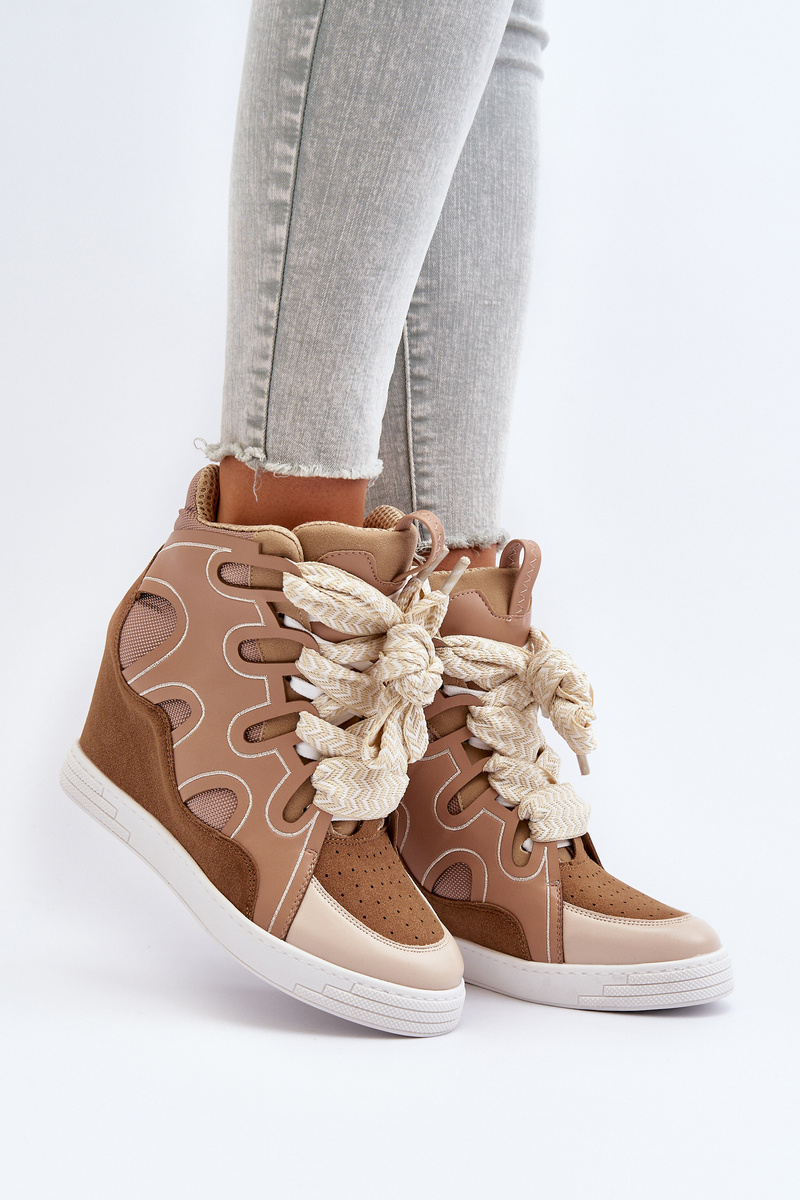 Women's sneakers made from a combination of eco leather and textile material. Set on a hidden wedge that will gently lift your silhouette. This model has double lacing. You should definitely have this style in your wardrobe if you value fashionable design! When choosing a size, please refer to the size chart.