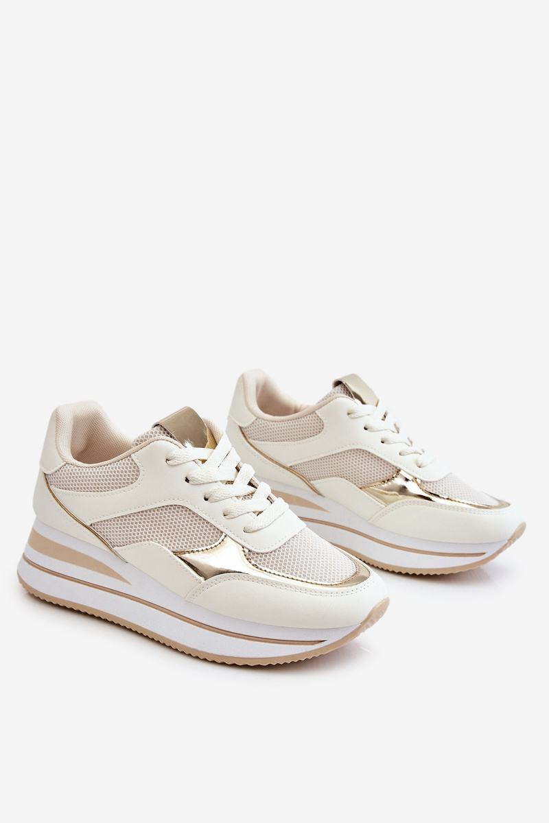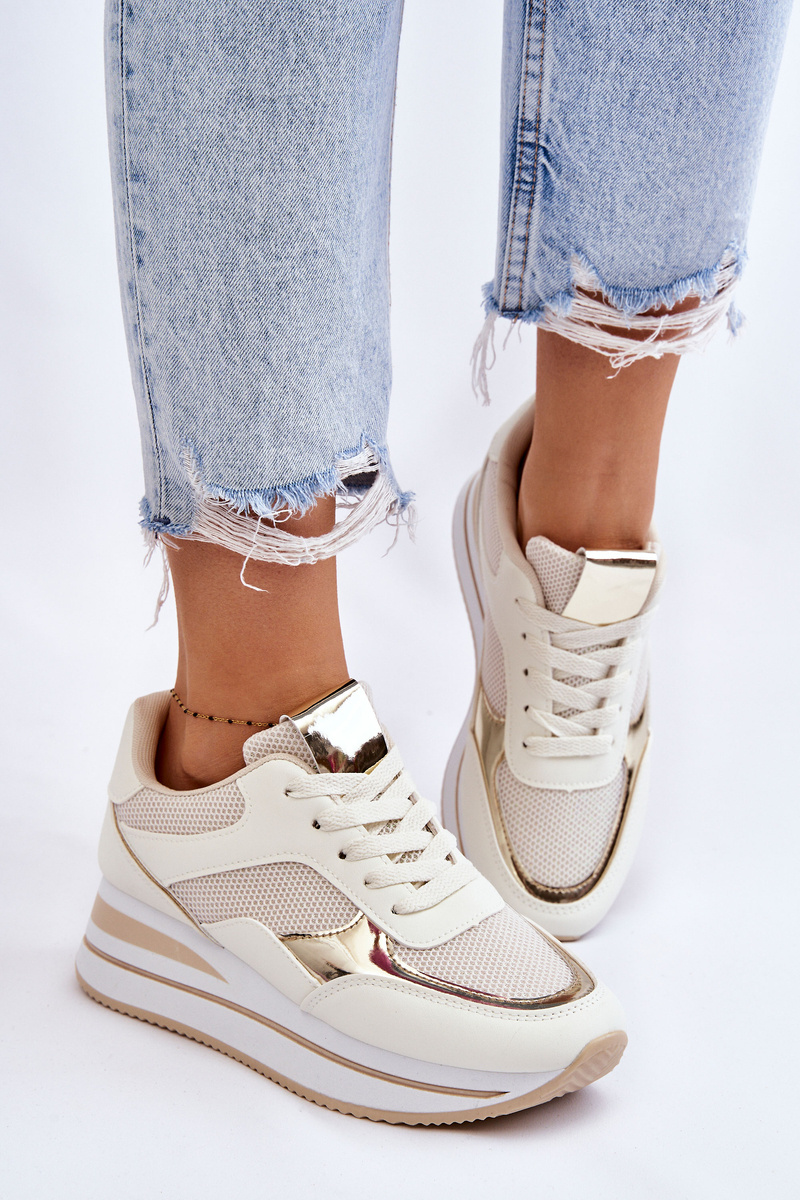 Classic, women's sports shoes have a delicate wedge and platform. This model has decorative, mirror elements made of plastic. The upper, on the other hand, is made of a combination of eco leather and textile material in the form of a mesh. This model has classic lacing. The material insole will allow for comfortable use of the footwear. When choosing a size, please refer to the size chart.