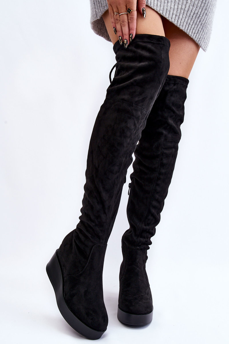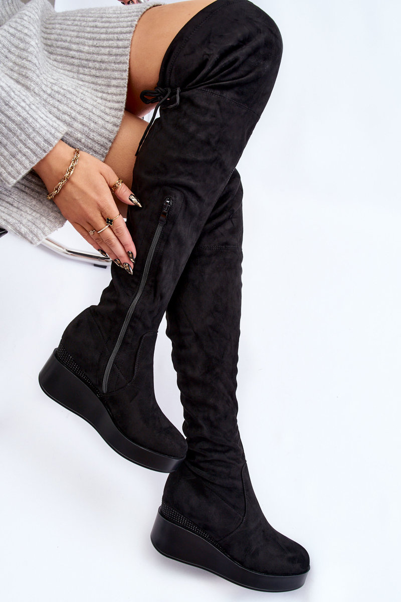 Great women's boots made of shading fabric. Slip-on model with an additional zipper on the side of the upper. The boots were placed on a wedge and platform. In addition, they were decorated with rhinestones. The heel is stiffened. Model behind the knee, with a tie at the top of the upper. Boots have insulation at the height of the foot. When choosing a size, please refer to the size chart.
