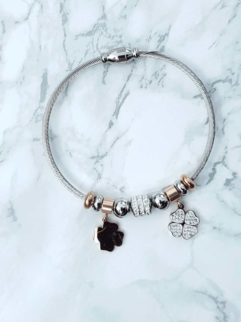 Women's Wire Bracelet with Rose Gold Charms Clovers Pendants