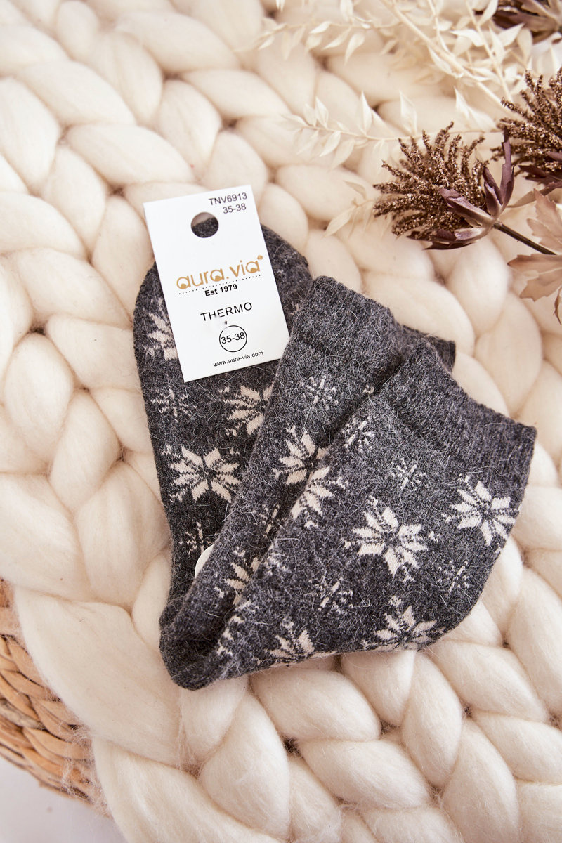 Warm women's socks are made mainly of wool. Perfect for cold winter days. They have snowflake patterns. The delicate welt will make them perfectly fit to the leg width. These thermoactive socks are perfect for every cold!