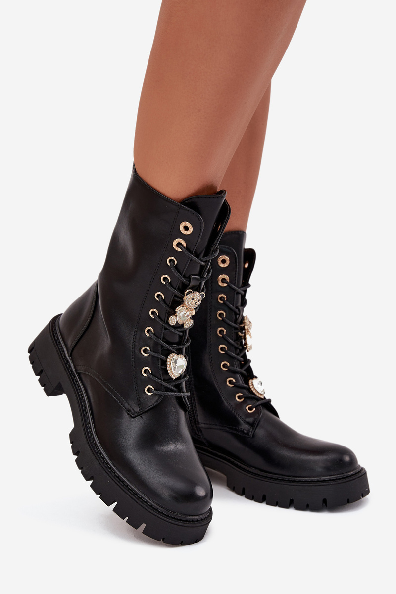 Women's ankle boots made of eco-leather are a combination of style and comfort for cooler days. The laced model with an additional zipper makes it easy to put on and adjust to the foot. The inside is insulated with shoe fleece, providing warmth even on freezing days. There are cute charms in the shape of a bear and a heart on the laces, adding a unique, fashionable touch to the boots. Perfect for everyday outings. When choosing a size, please refer to the size chart. When choosing a size, please refer to the size chart.