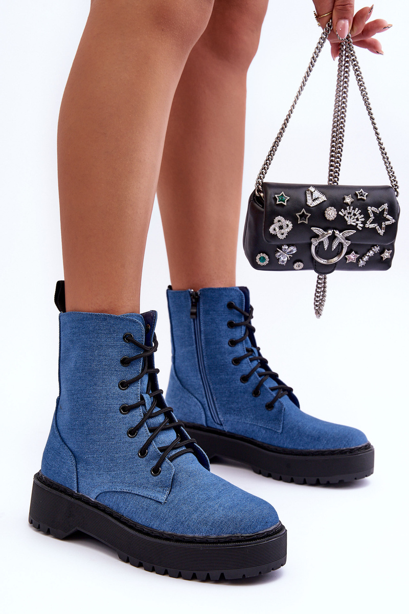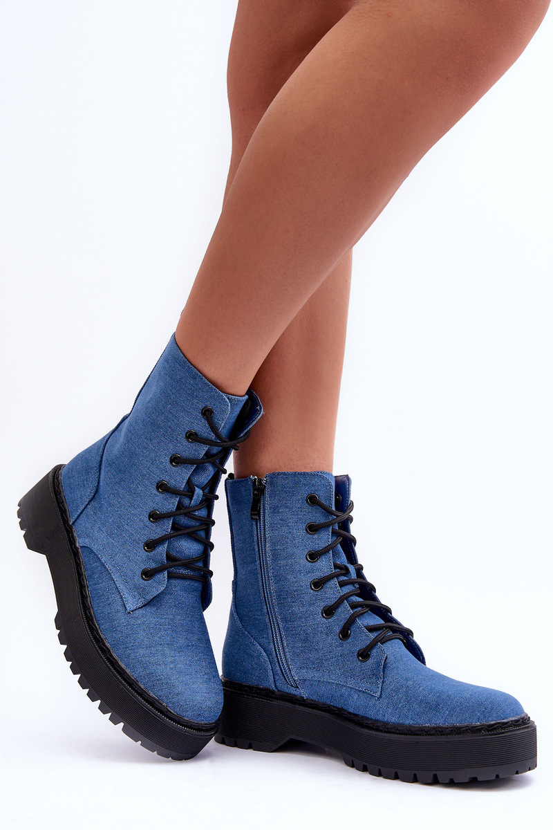 Fashionable women's boots were made of textile material. Flat heel and platform will provide stability with every step. They are closed on the side of the upper with a zipper and additionally laced. The toe cap in this shoe is stiffened. Insulated with a footbed. Great model for autumn and winter outfits! When choosing a size, please refer to the size chart.