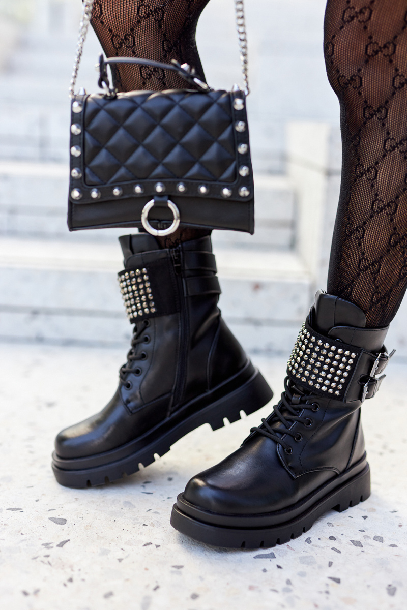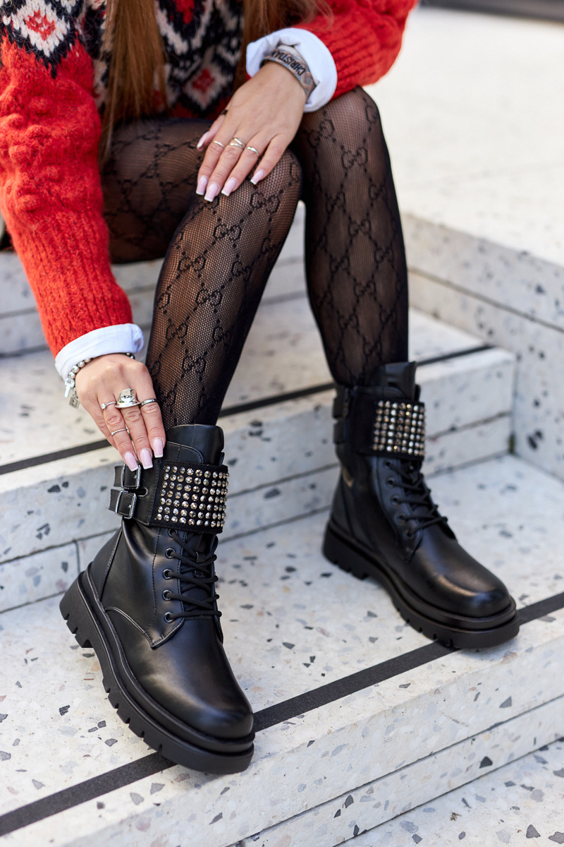 High baggers made of ecological leather. With a zipper on the side for easy putting on the shoes. Insulated with shoe blanket. Decorative studs and buckles underline the uniqueness of these shoes. They also have a binding. When choosing the size, please refer to the size chart.