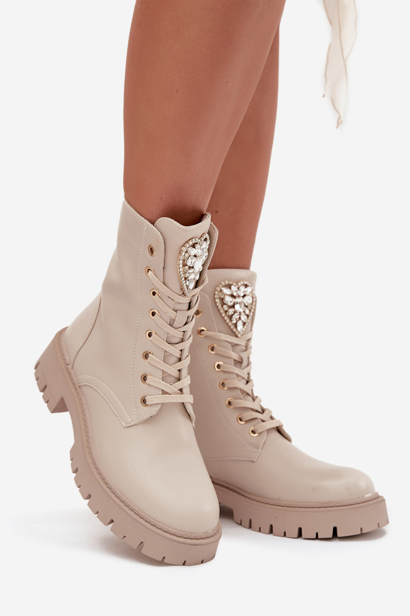 Women's eco leather ankle boots are a charming combination of comfort and trendy detail. The lace-up and zip model provides easy wear and a perfect fit, while the decorative heart with crystals on the tongue adds a subtle, feminine shine, perfectly complementing daily outfits. Please refer to the size chart when choosing your size. When choosing a size, please refer to the size chart.