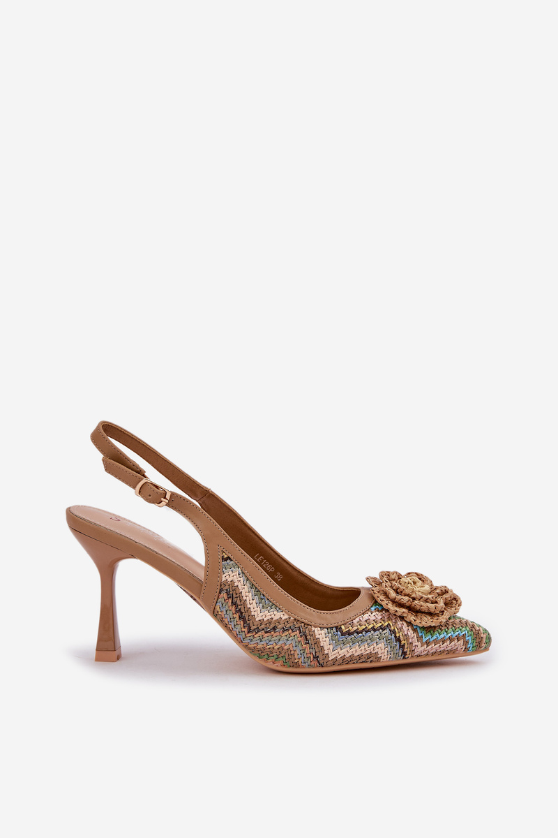 The woven stilettos are an exceptional choice for summer days. Open heels and pointed toes give them a subtle yet striking character. Adorned with a flower that serves as a delicate accent, these stilettos attract attention. Fastened with an adjustable strap and buckle, they guarantee comfort and a perfect fit. Perfect for special occasions, these stilettos beautifully complement any evening outfit. When choosing a size, please refer to the size chart.