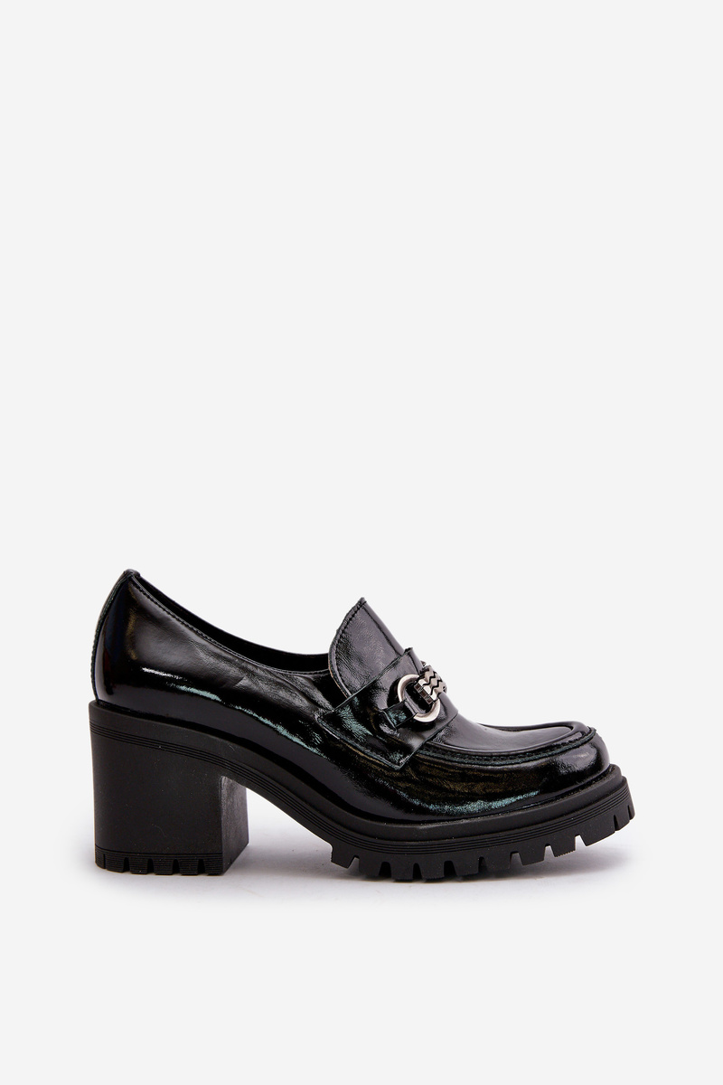 Lacquered women's loafers made of natural leather are an elegant choice for any occasion. Set on a block heel, they provide stability and comfort while wearing. There is a decoration at the front of the shoe. Additionally, this model features a reinforced heel. Perfect for both casual and more formal styles. When choosing a size, please refer to the size chart.