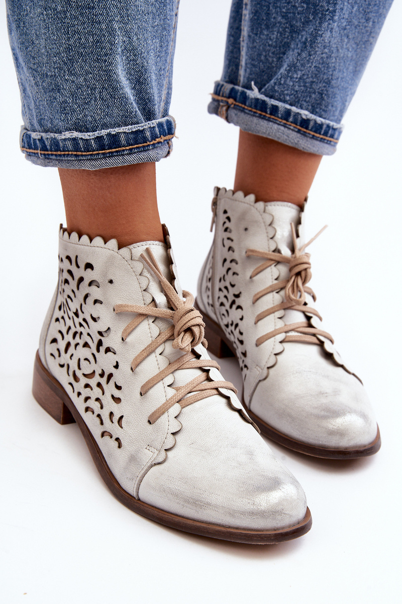 Women's ankle boots are made of high-quality natural leather. Set on a flat heel. The shaft above the ankle is decorated with an openwork pattern. Rounded toes. The insole of natural leather will provide comfort during use. Classically laced model. Perfect for trousers, skirts, and dresses. You definitely should have them! When choosing a size, please refer to the size chart.