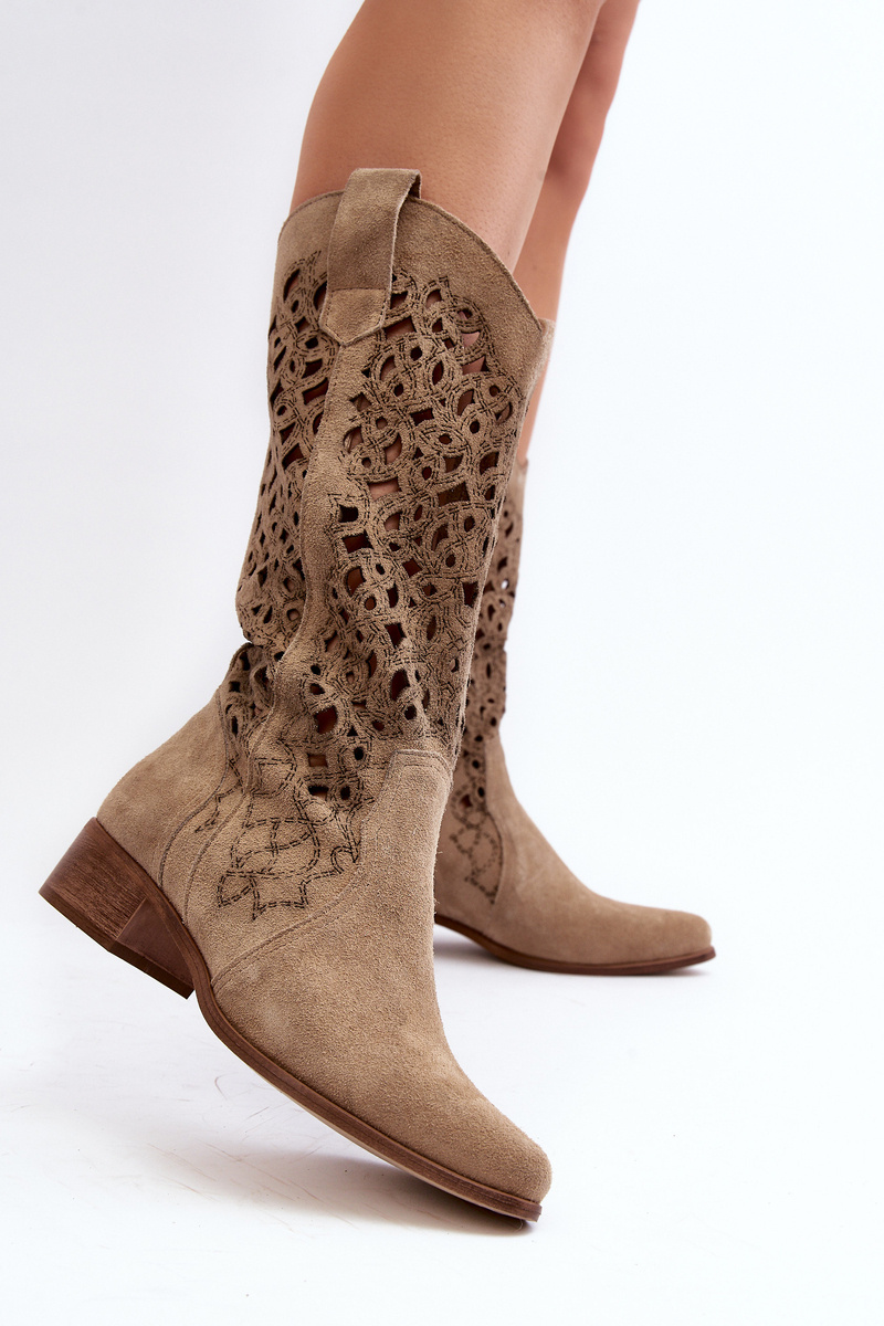 Zazoo 3403 Openwork Low Heel Women's Boots Beige