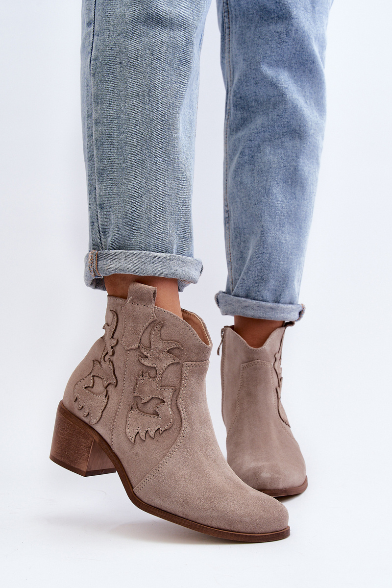 Women's boots made of natural suede. Set on a heel in the form of a low column. Fastened with a zipper. The ankle adorned with patches. Rounded toes. Soft, leather insole will provide comfort during long-term wear. This style will certainly complement many spring stylizations! When choosing a size, please refer to the size chart.