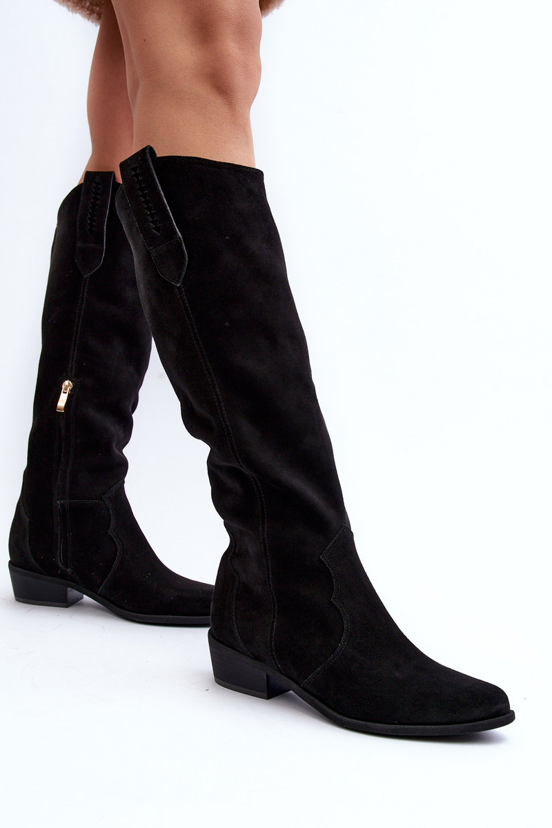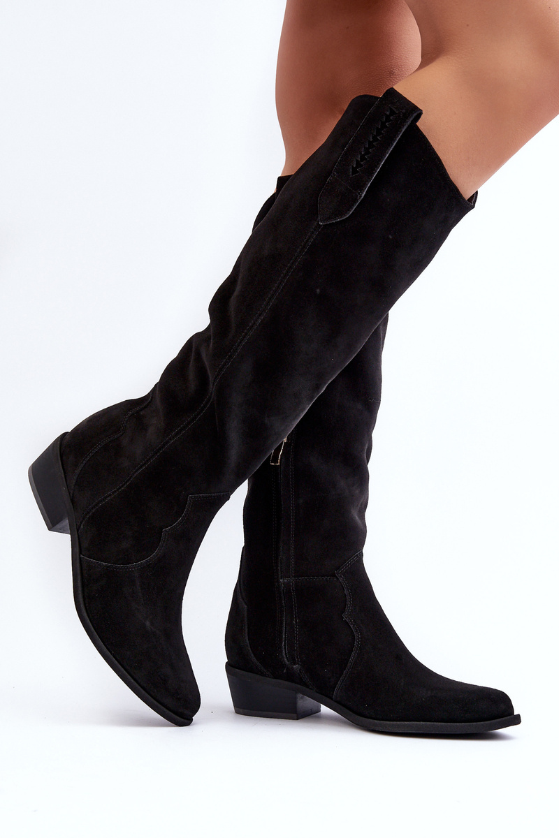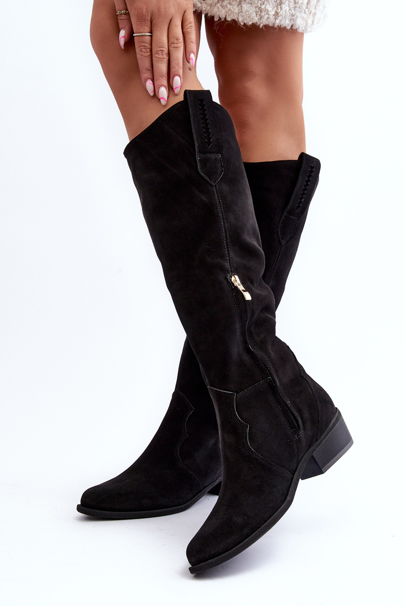 Women's cowboy-style boots are extremely fashionable footwear for the spring-autumn season. Made of natural suede. The stable, low heel makes them comfortable and perfect for everyday wear. The slip-on model with an additional zipper closure makes it easy to put on the boots. The shaft reaches just below the knee. The leather, soft insole provides comfort during wear. These boots will complement various stylings perfectly. They should definitely be in your wardrobe! When choosing a size, please refer to the size chart.