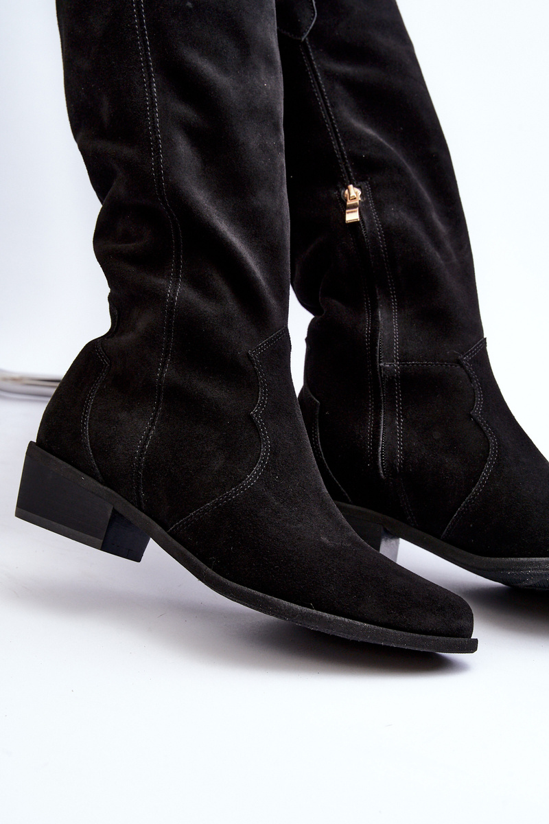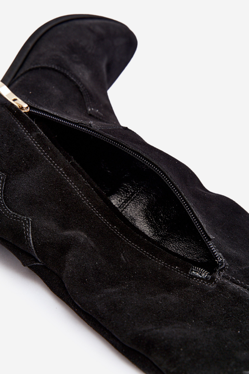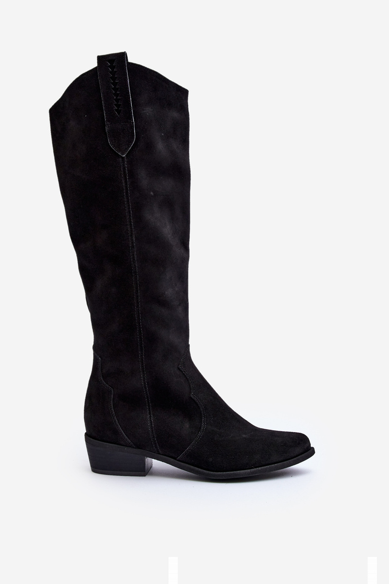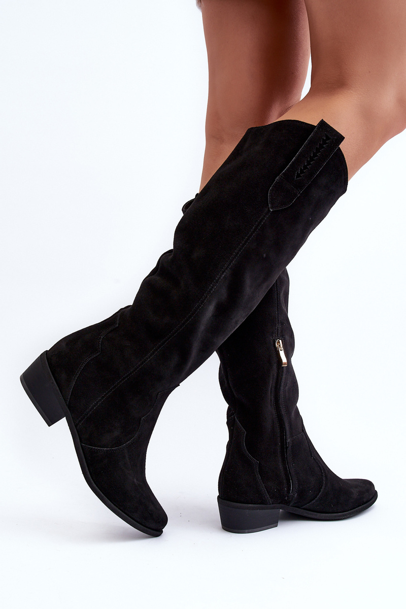 Women's cowboy-style boots are extremely fashionable footwear for the spring-autumn season. Made of natural suede. The stable, low heel makes them comfortable and perfect for everyday wear. The slip-on model with an additional zipper closure makes it easy to put on the boots. The shaft reaches just below the knee. The leather, soft insole provides comfort during wear. These boots will complement various stylings perfectly. They should definitely be in your wardrobe! When choosing a size, please refer to the size chart.