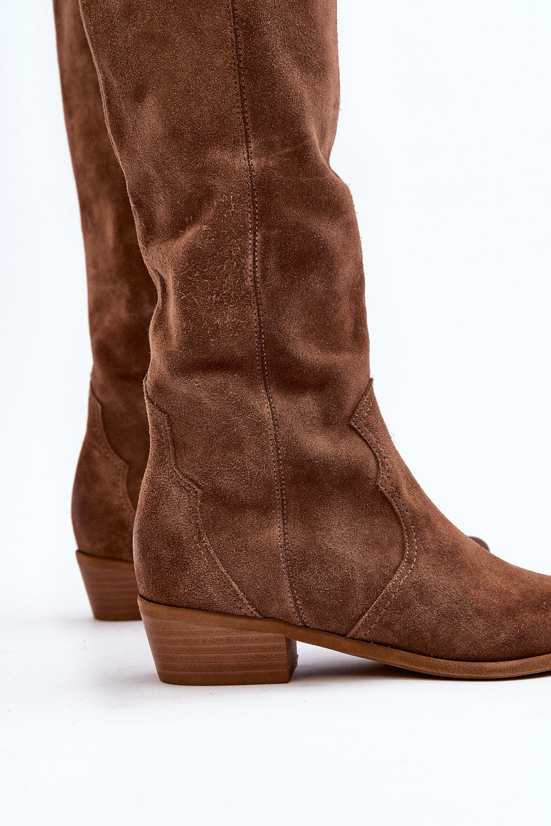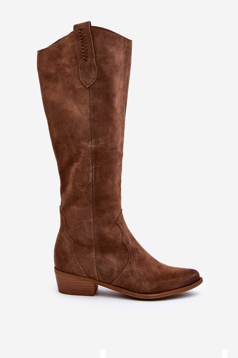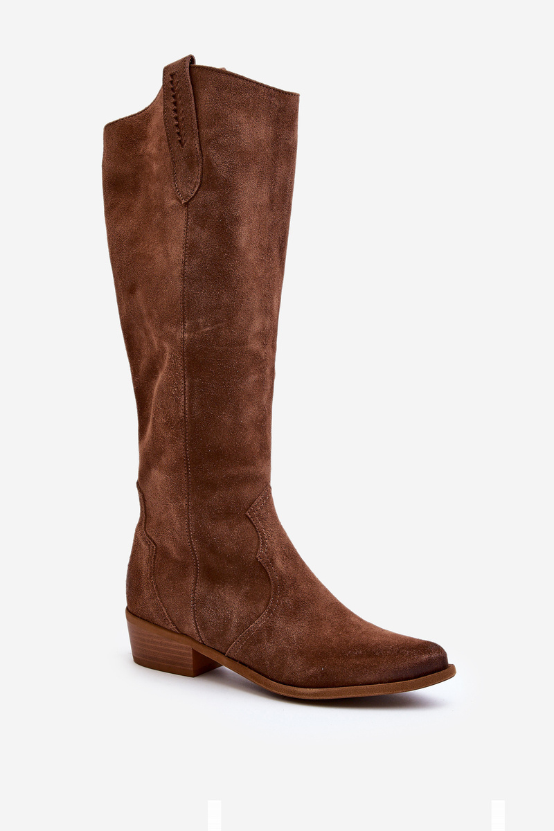 Women's cowboy-style boots are extremely fashionable footwear for the spring-autumn season. Made of natural suede. The stable, low heel makes them comfortable and perfect for everyday wear. The slip-on model with an additional zipper closure makes it easy to put on the boots. The shaft reaches just below the knee. The leather, soft insole provides comfort during wear. These boots will complement various stylings perfectly. They should definitely be in your wardrobe! When choosing a size, please refer to the size chart.