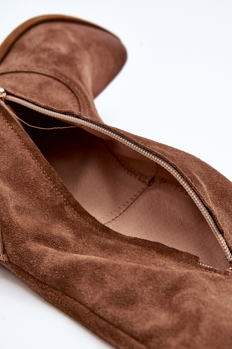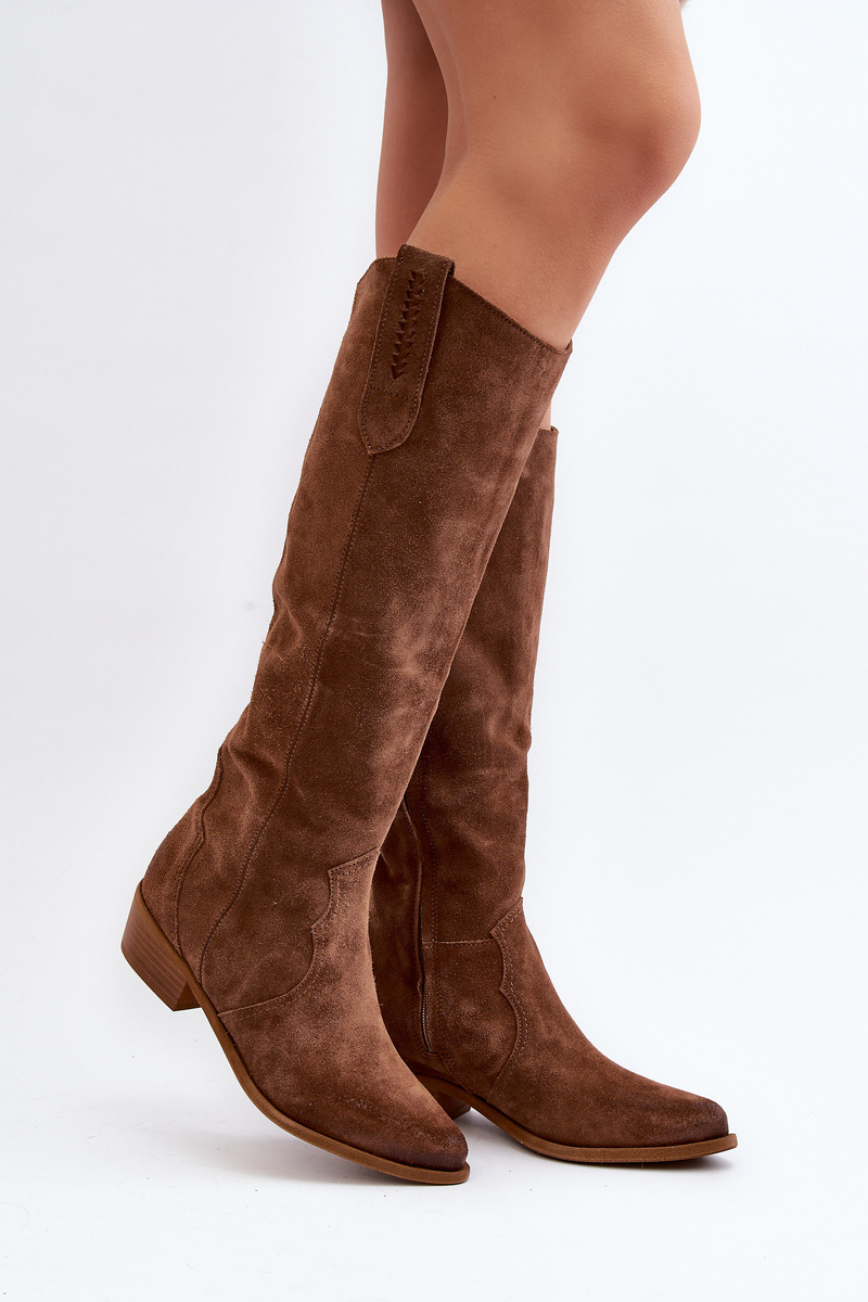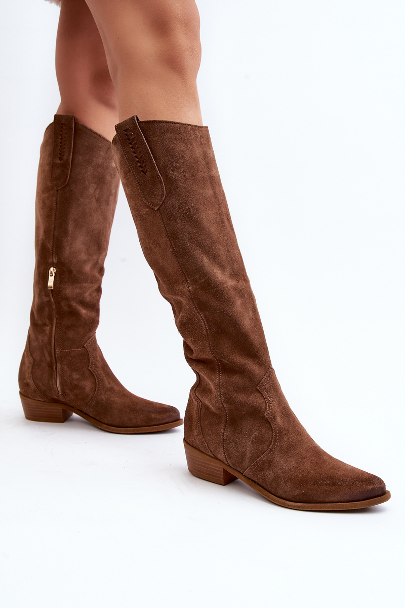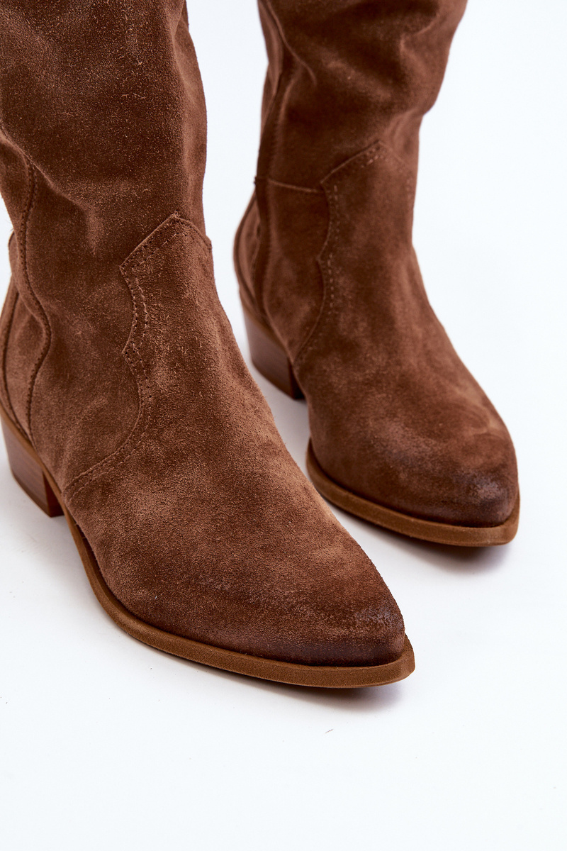 Women's cowboy-style boots are extremely fashionable footwear for the spring-autumn season. Made of natural suede. The stable, low heel makes them comfortable and perfect for everyday wear. The slip-on model with an additional zipper closure makes it easy to put on the boots. The shaft reaches just below the knee. The leather, soft insole provides comfort during wear. These boots will complement various stylings perfectly. They should definitely be in your wardrobe! When choosing a size, please refer to the size chart.