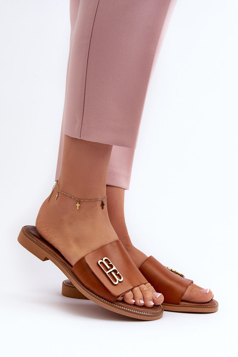 Elegant women's leather slippers. Set on a flat heel. Gold decoration on the front. Thanks to the high-quality workmanship, these slippers will become an integral part of summer stylings! When choosing a size, please refer to the size chart.