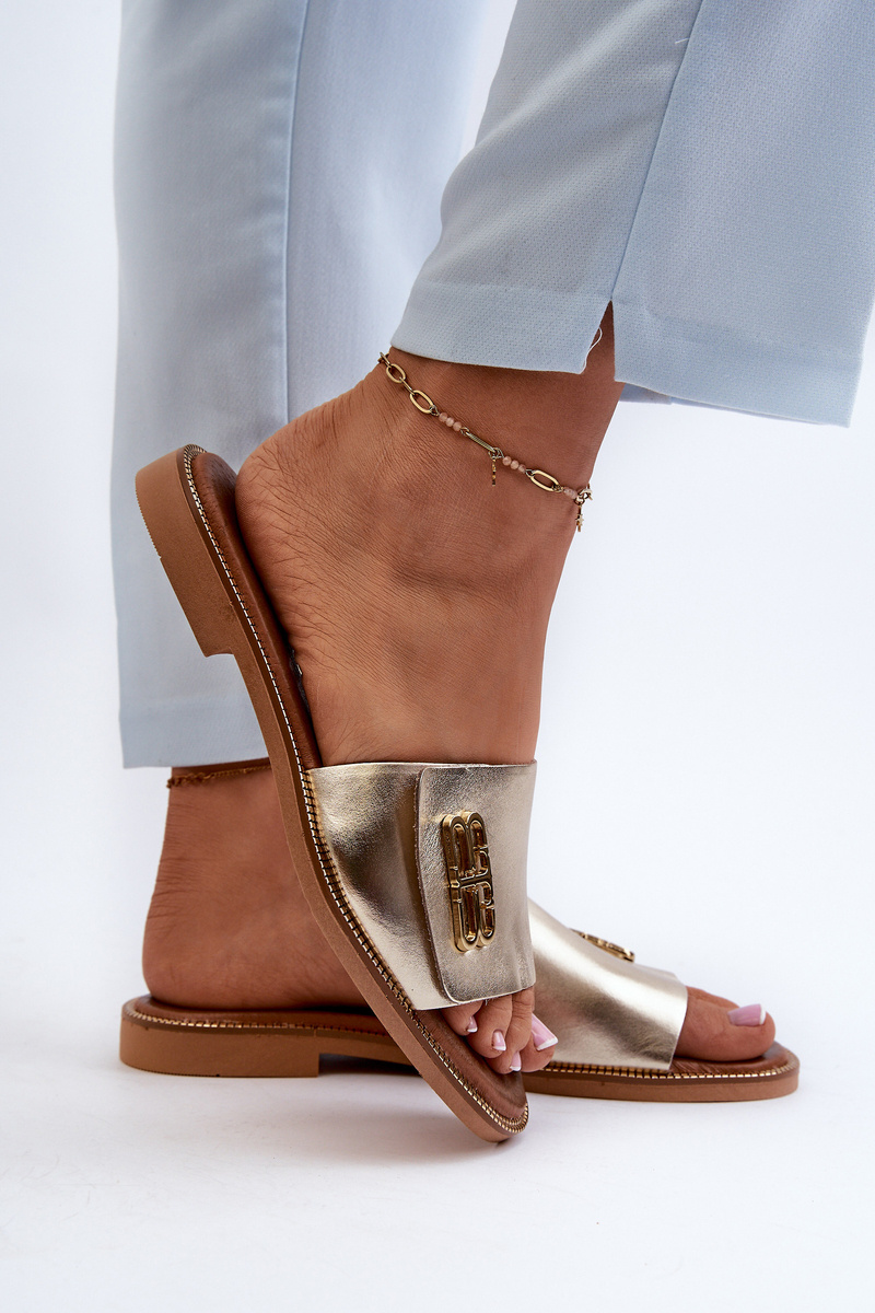 Elegant women's leather slippers. Set on a flat heel. Gold decoration on the front. Thanks to the high-quality workmanship, these slippers will become an integral part of summer stylings! When choosing a size, please refer to the size chart.