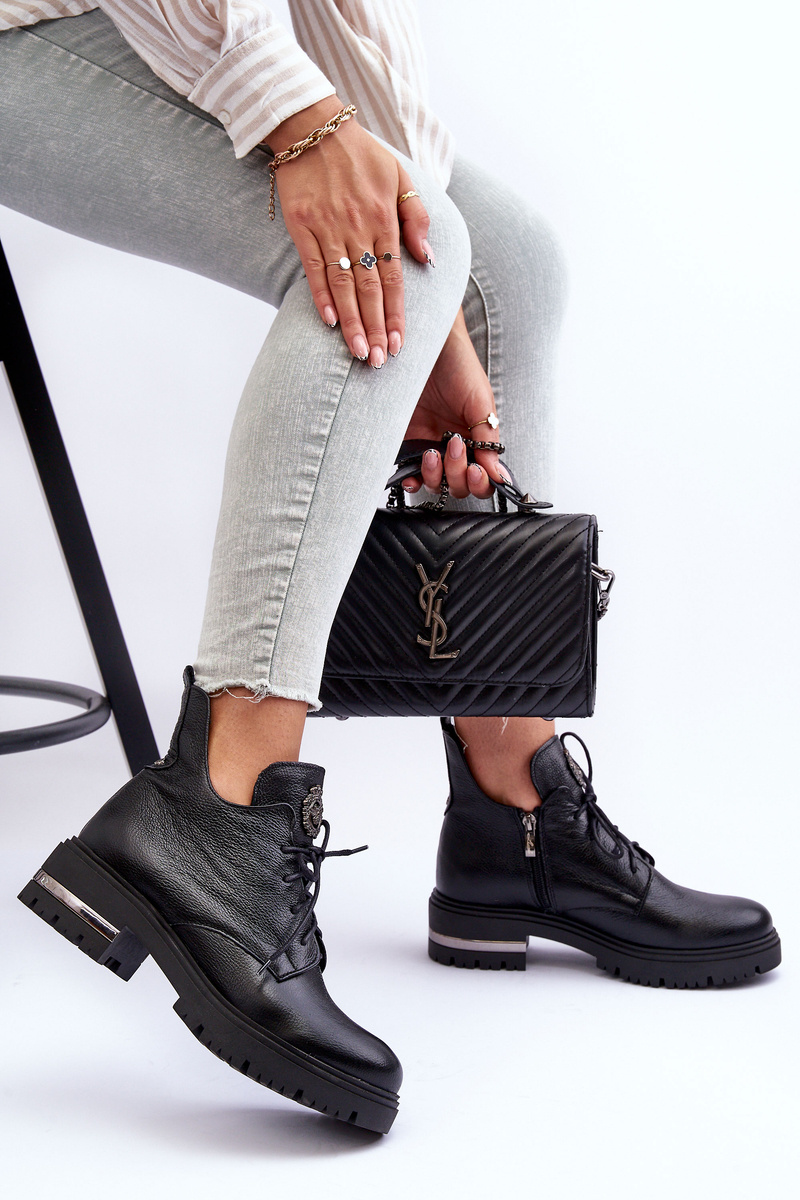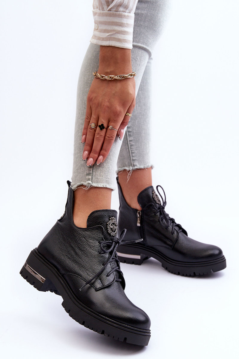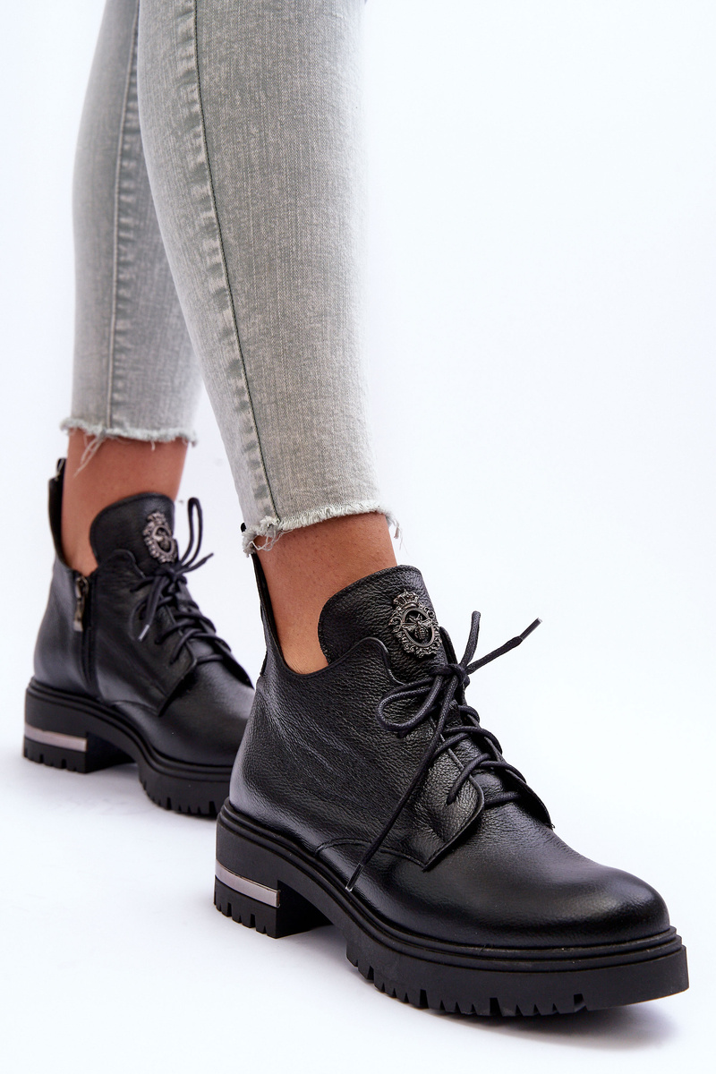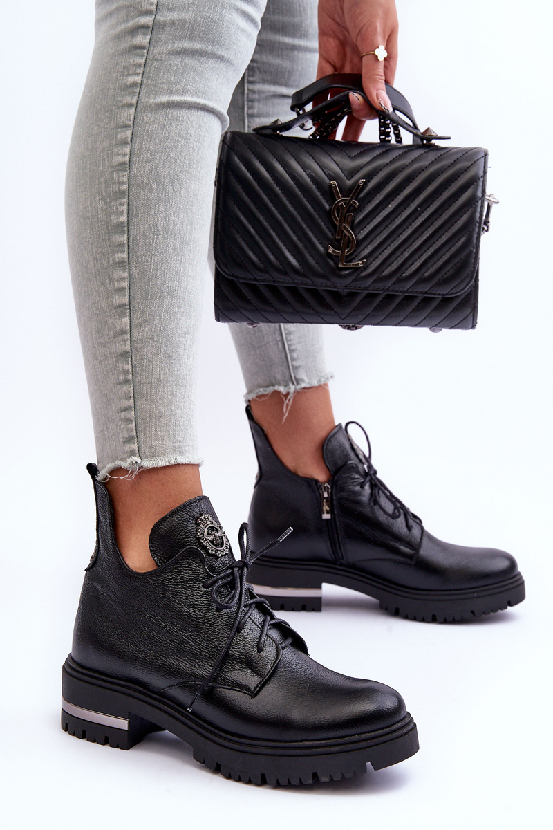 Fashionable boots with an ornament on the tongue. They were made of high-quality natural leather. Boots fastened with a zipper and lace-up. The irregular upper will highlight many styles! The boots are mounted on a flat heel and platform. Insulated with a shoe blanket. The soft insole will ensure comfort during use. When choosing a size, please use the size chart.
