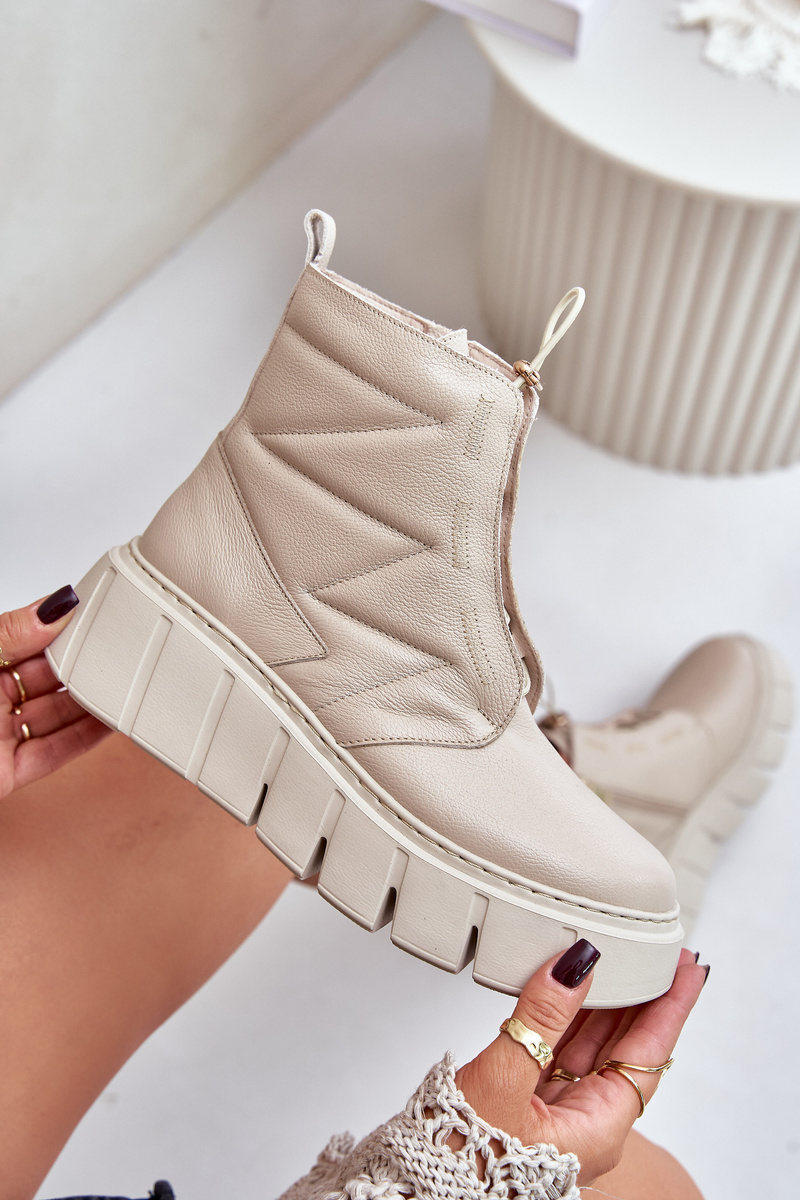 Naisten saapad, mis on valmistatud looduslikust nahast, paigaldatud platvormile ja kontsadele, on ideaalne valik jahedamateks päevadeks. Villaga vooderdatud, tagavad need sooja ja mugavuse kandmisel. Mudel, mis kinnitub tõmblukuga, teeb jalga panemise lihtsaks ning elegantne disain muudab saapad ideaalselt sobivaks nii igapäevaste kui ka stiilsemate riietuste jaoks. Suuruse valimisel vaadake suurustabelit.