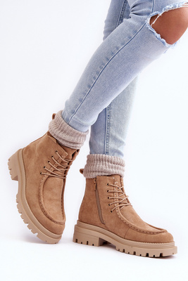 Botki Workery Ocieplane Zamsz Płaski Obcas Ciemnobeżowe Nacelle NS336P