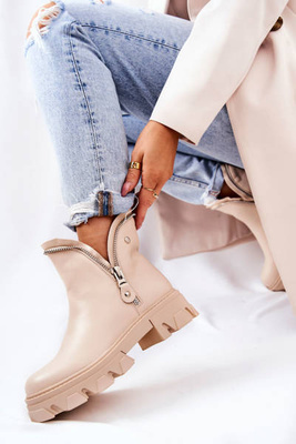 Skórzane Botki Ozdobne Suwaki Beżowe Deborah