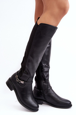 Damskie Kozaki Eko Skóra Płaski Obcas Ozdobny Pasek Czarne Palisse